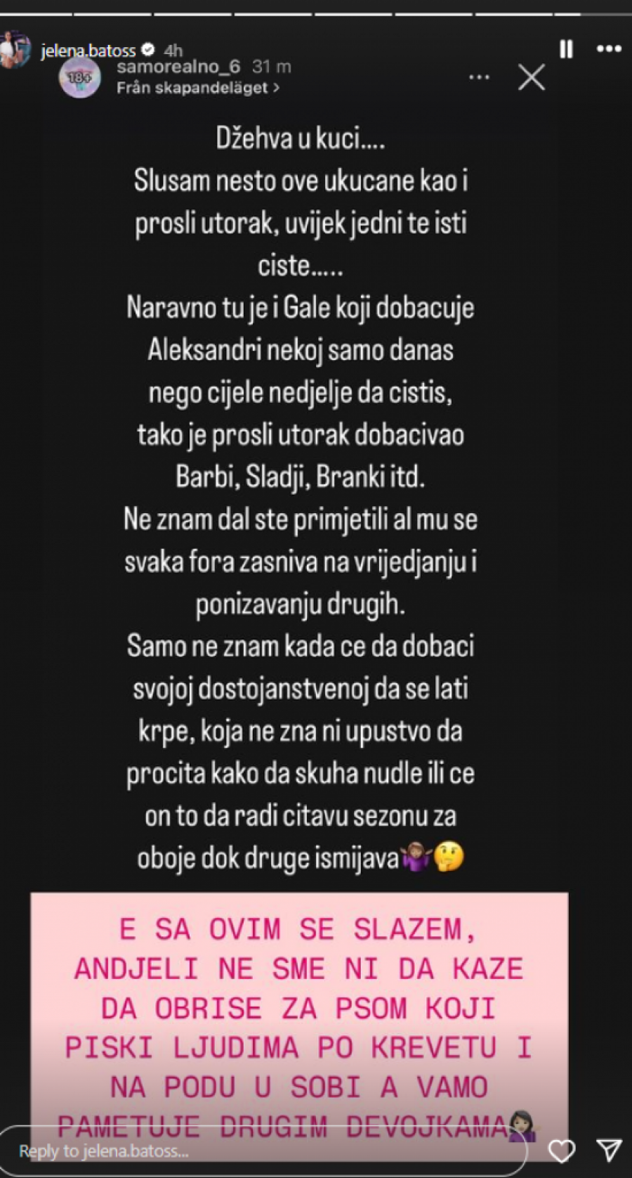 - E sa ovim se slažem, Anđeli ne sme ni da kaže da obriše za psom koji piški ljudima po krevetu i na podu u sobi, a ovamo pametuje drugim devojkama - napisala je Batos u pomenutoj objavi.