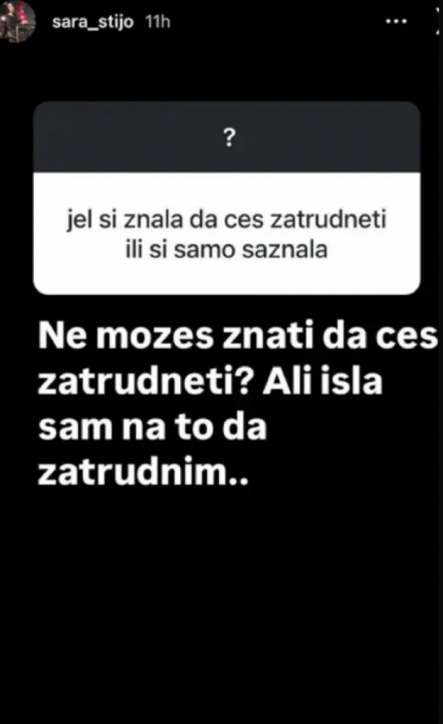 Sara je izazvala brojne reakcije kada je na svom Instagram storiju objavila vest da je u drugom mesecu trudnoće. Ona je otkrila da je svesno išla na trudnoću, ističući da je to bila njen lični izbor. "Ne možeš znati da ćeš zatrudneti, ali išla sam na to da zatrudnim", napisala je Sara, ostavljajući mnoge iznenađene i znatiželjne da saznaju više o njenim motivima i odluci.