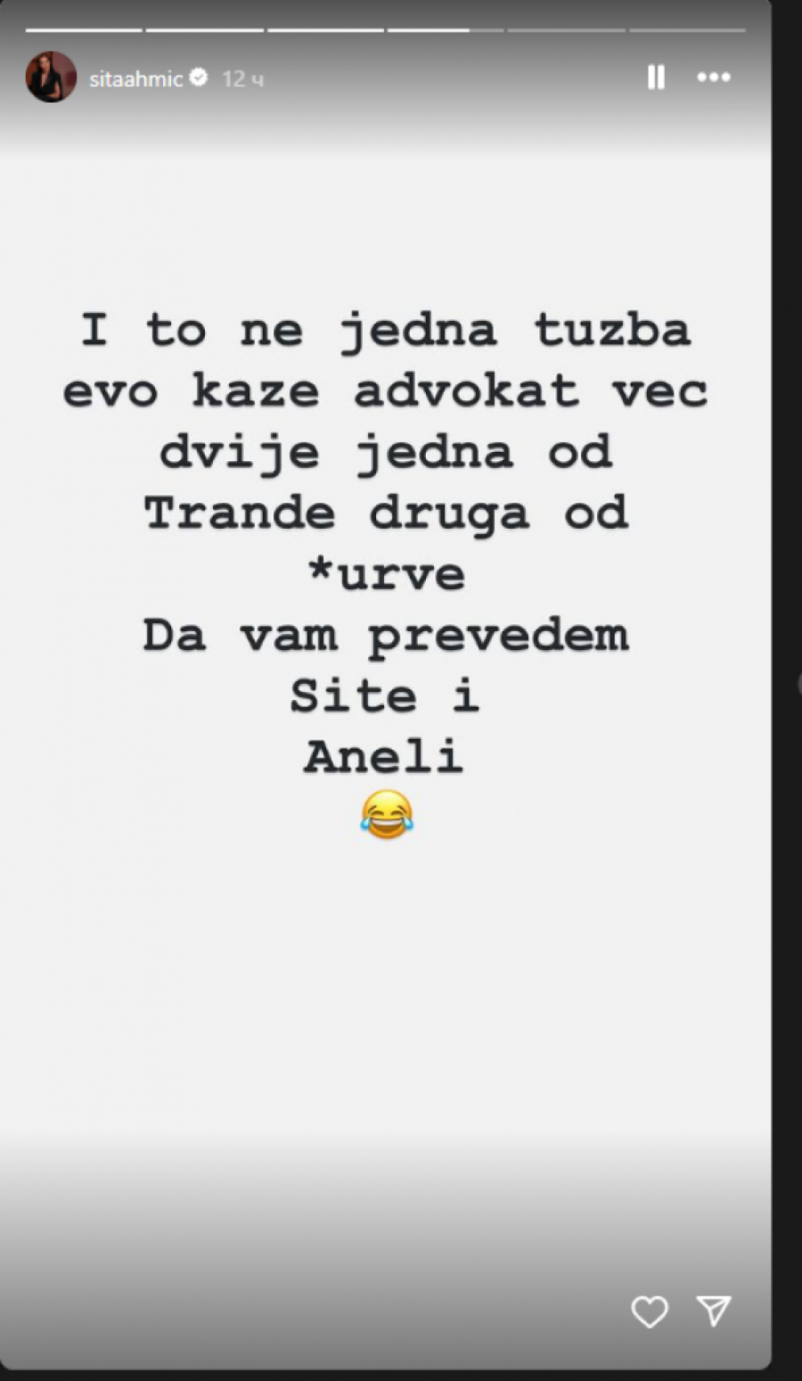 - I to ne jedna tužba, evo kaže advokat već dve. Jedna od trandže, druga od *urve. Da vam prevedem, Site i Aneli - poručila je Ahmićeva.