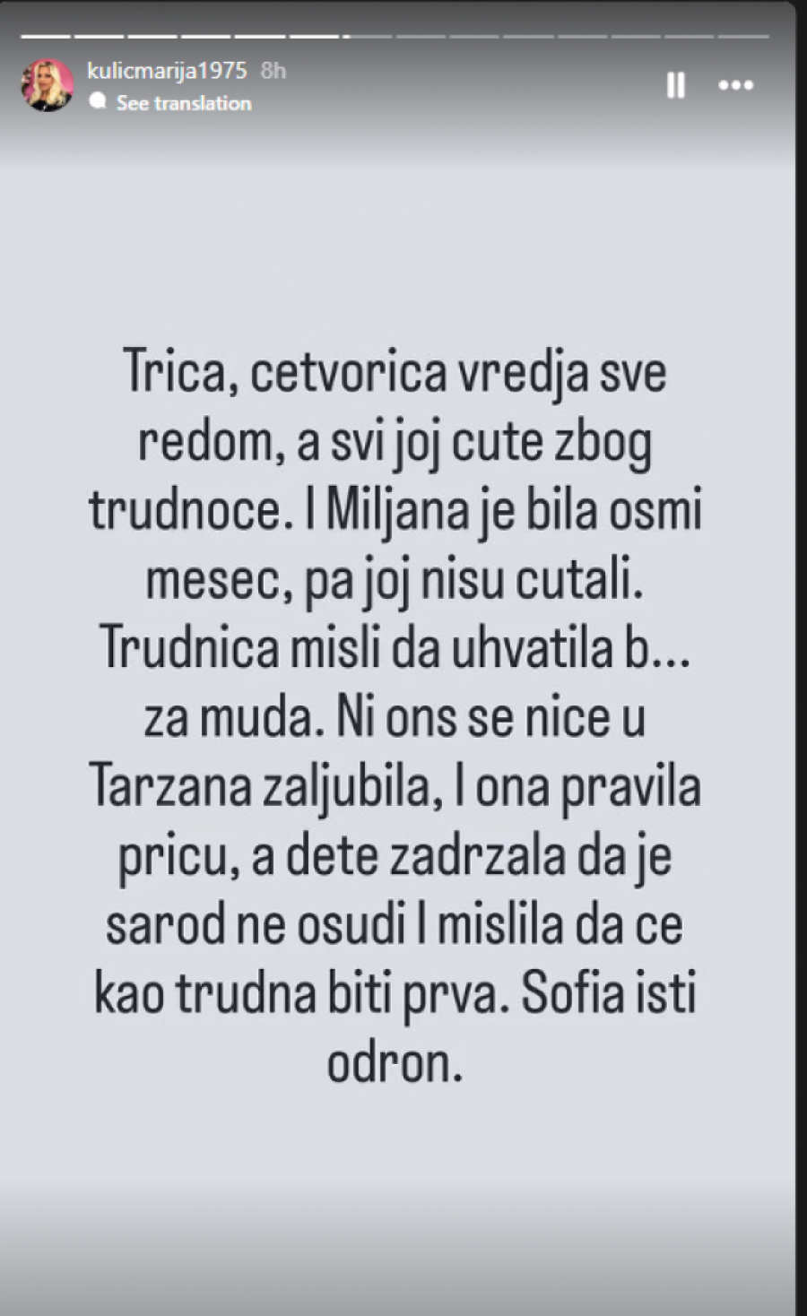 - Trica, četvorica (Milica) vređa sve redom, a svi joj ćute zbog trudnoće. I Miljana je bila osmi mesec, pa joj nisu ćutali. Trudnica misli da uhvatila b... za m*da. Ni ona se nije u Tarzana zaljubila, i ona je pravila priču, a dete zadržala da je narod ne osudi i mislila da će kao trudna biti prva. Sofija isti odron - istakla je Marija putem storija na društvenoj mreži Instagram.