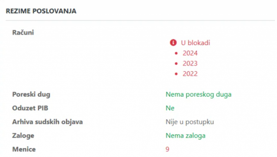 Svi računi njenog salona nameštaja su u blokadi godinama unazad. Iako je firmu otvorila u januaru 2021. godine, blokada računa je nastupila već naredne, 2022. godine. Računi njenog salona bili su blokirani i 2023., kao i ove, 2024.