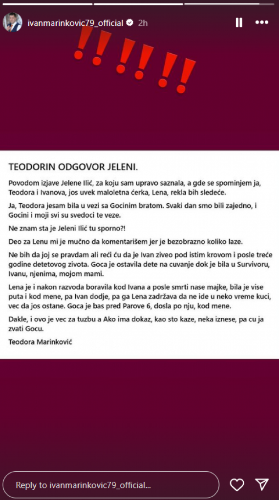 Teodora i Ivanova, još uvek maloletna ćerka, Lena, rekla bih sledeće. Ja, Teodora jesam bila u vezi sa Gocinim bratom. Svaki dan smo bili zajedno, i Gocini i moji svi su svedoci te veze. Ne znam šta je Jeleni Ilić tu sporno?! Deo za Lenu mi je mučno da komentarišem jer je bezobrazno koliko laže. Ne bih da joj se pravdam, ali reći ću da je Ivan živeo pod istim krovom i posle treće godine detetovog života. Goca je ostavila dete na čuvanje dok je bila u "Survivor", Ivanu, njenima, mojom mami. Lena je i nakon razvoda boravila kod Ivana a posle smrti naše majke, bila je više puta i kod mene, pa Ivan dođe, pa ga Lena zadržava da ne ide u neko vreme kući, već da još ostane. Goca je baš pred Parove 6, došla po nju, kod mene.