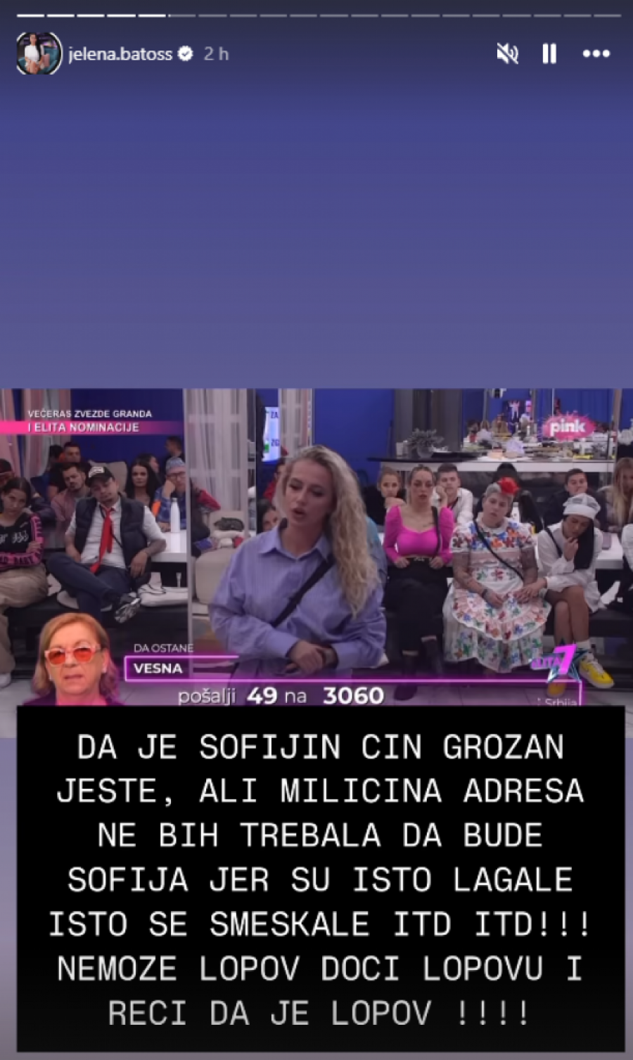 Trudna Milica Veličković ušla je u rijaliti ,,Elita 8" kako bi se suočila sa Borislavom Borom Terzićem i Sofijom Janićijević. Kako mnogi komentarišu njihov odnos, bivša zadrugarka Jelena Batos na Instagramu je objavila niz prozivki na račun toga što je Terzi prećutala aferu sa Adamom Đoganijem.