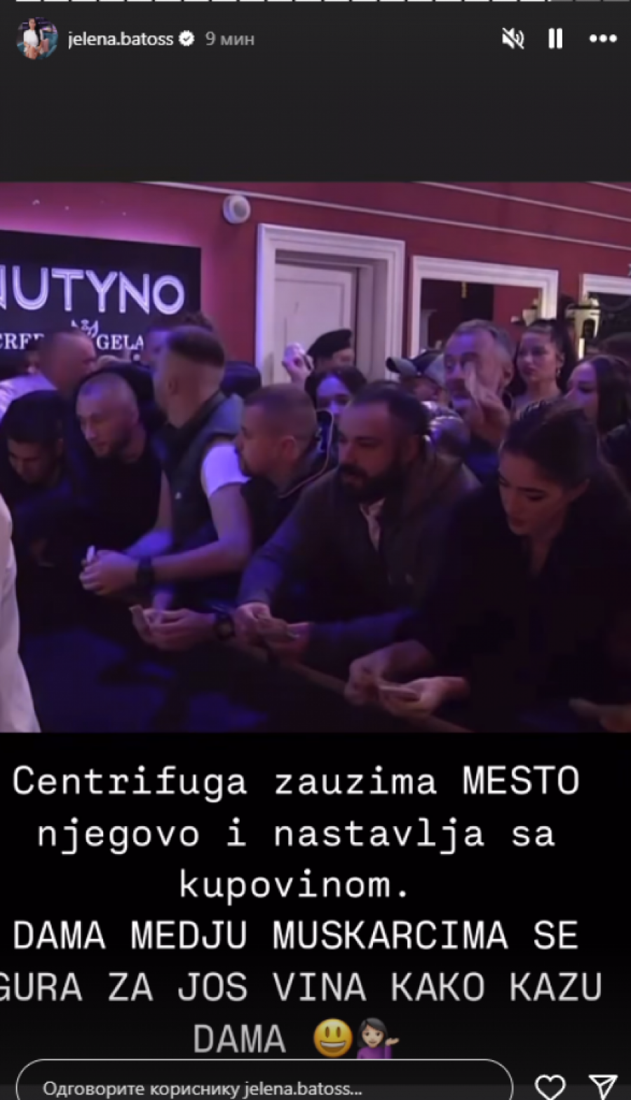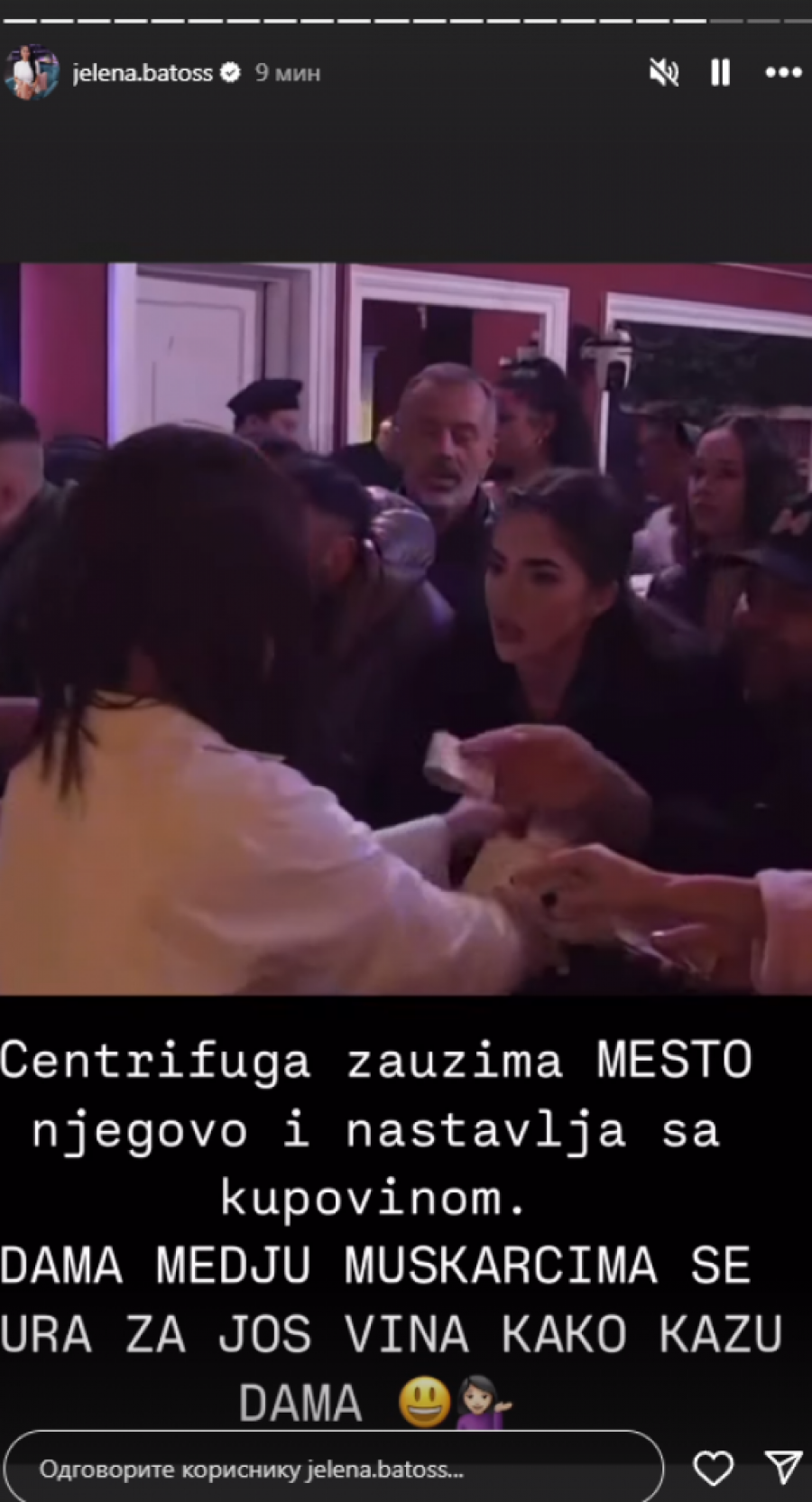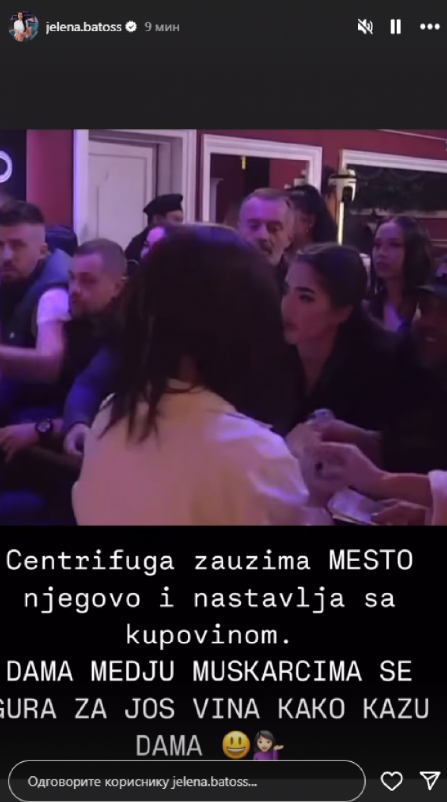 Iako je Nenad Marinković Gastoz već uzeo dovoljno alkohola za oboje, ona je "na kvarno" pokušala da isprosi od konobara dodatno piće, što joj je odbijeno. Najpre je pokušala kod jednog konobara, koji joj je skrenuo pažnju i objasnio da moraju svi podjednako da dobiju, a onda je dozivala ostale zaposlene.