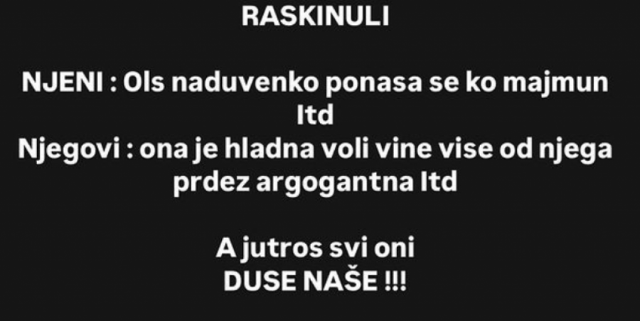 - Pratim društvene mreže, vidim Anđela i Gastoz raskinuli. Njeni: Ološ, naduvenko, ponaša se kao majmun itd. Njegovi: Ona je hladna, gleda s visine, arogantna, voli prdež itd. A jutros svi oni: duše naše - glasila je objava koja je povukla veliku debatu.