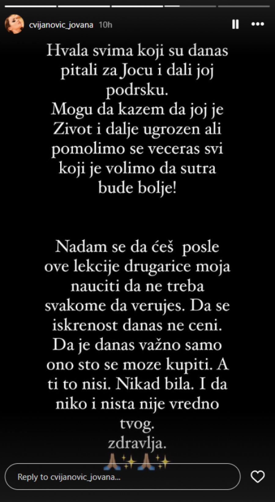- Hvala svima koji su danas pitali za Jocu i dali joj podršku. Mogu da kažem da joj je život i dalje ugrožen, ali moimo se večeras svi koji je voliko da bde boje sutra. Nadam se da ćeš posče ove ekcije drugarice moja da naučiti da ne treba svakom da veruješ. Da se iskrenost danas ne ceni. Da je danas samo važno ono što se može kupiti. A to nisi ti. Nikad bila. I da niko i išta nije vredno tvofa zdravlja - gasilo je naredno obraćanje.