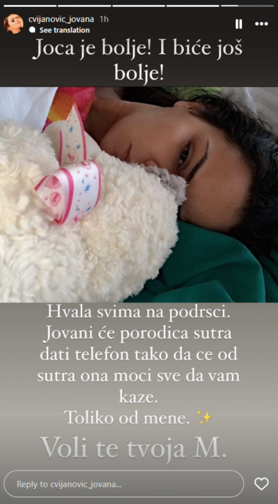 - Joca je bolje, i biće još bolje! Hvala svima na podršci. Jovani ćre porodica sutra dati teefon, tako da će od sutra ona moći da vam kaže. Toliko od mene. Voli te tvoja M. - stajalo je u poslednjem obraćanju.