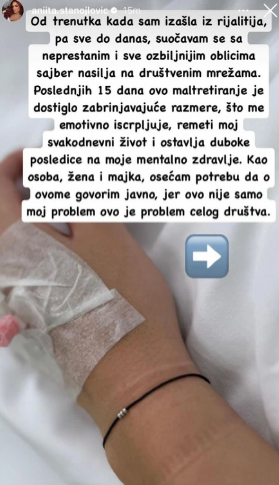 - Od trenutka kada sam izašla iz rijalitija, pa sve do danas, suočavam se sa neprestanim i sve ozbiljnijim oblicima sajber nasilja na društvenim mrežama. Poslednjih 15 dana ovo maltretiranje je dostiglo zabrinjavajuće razmere, što me emotivno iscrpljuje, remeti moj svakodnevni život i ostavlja duboke posledice na moje mentalno zdravlje. Kao osoba, žena i majka, osećam potrebu da o ovome govorim javno, jer ovo nije samo moj problem, ovo je problem celog društva... - napisala je Anita i dodala: