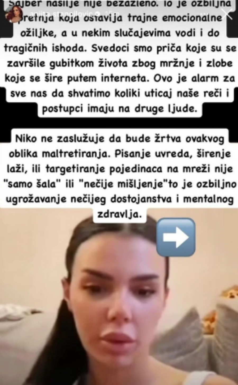 - Pišem ovo ne samo zbog sebe, već i zbog svih onih koji ćute i trpe tišinu. Ne smemo dozvoliti da ovakve pojave postanu prihvaćene ili ignorisane. Hajde da zajedno osudimo sajber nasilje i radimo na tome da se ovakvom ponašanju stane na put. Vaša podrška i ljubav mi sada znače više nego ikada. Hvala vam što ste uz mene u ovim teškim trenucima - saopštila je Anita Stanojlović putem Instagrama.