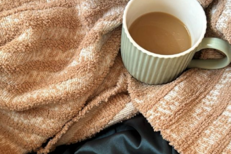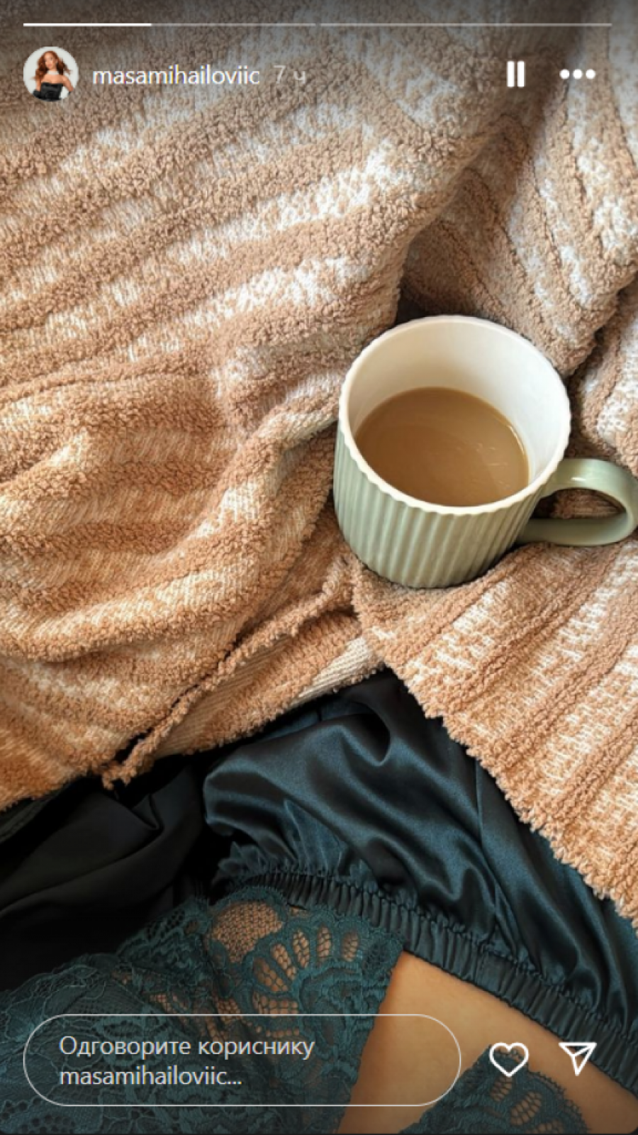 Na slici je Maša u prvom planu sa svojim nagim stomakom, dok uživa u jutarnjoj kafi.