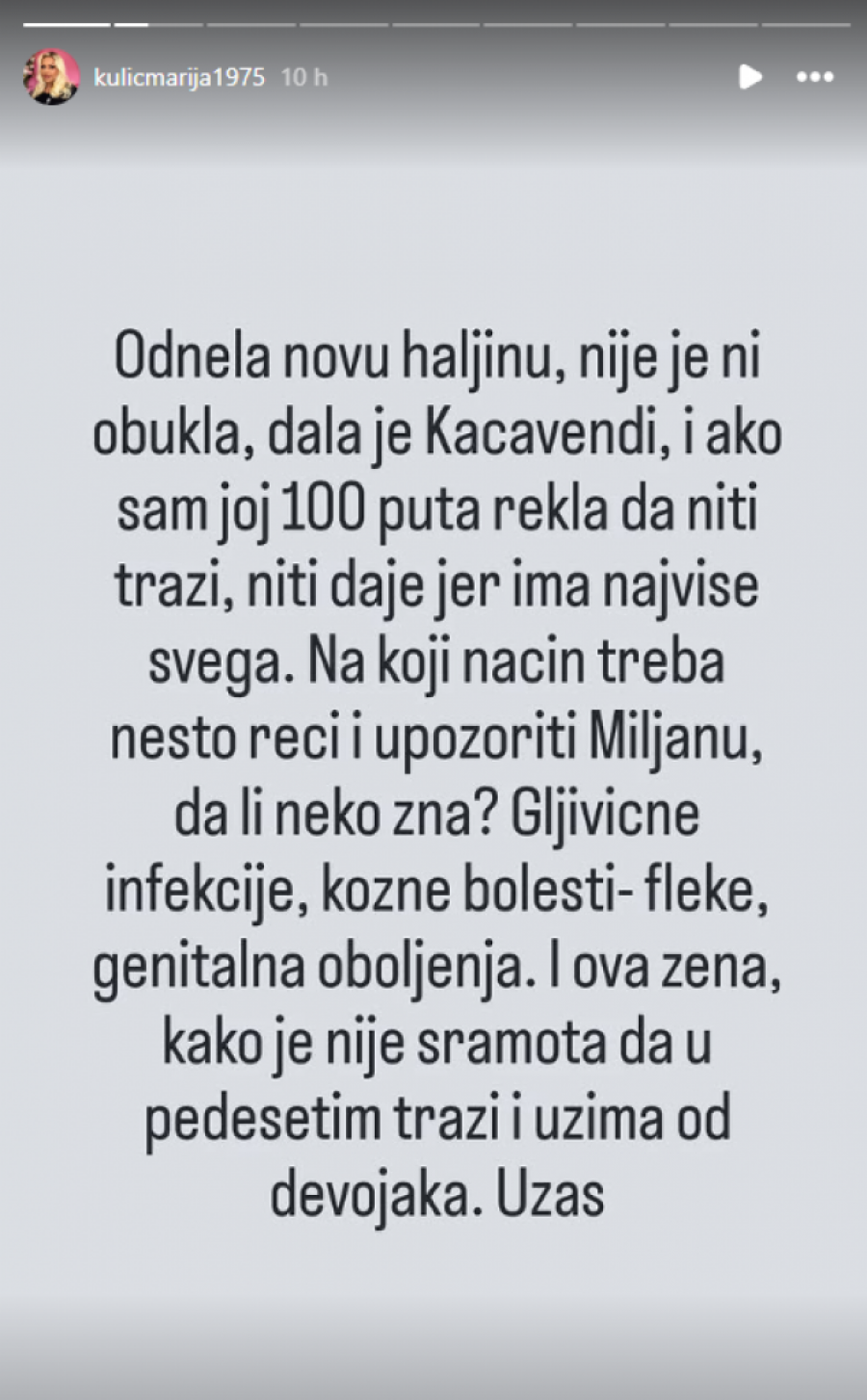 - Odnela novu haljinu, nije je ni obukla, dala je Kačavendi, i ako sam joj 100 puta rekla da niti traži, niti daje, jer ima najviše svega. Na koji način treba nešto reći i upozoriti Miljanu, da li neko zna?! Gljivične infekcije, kožne bolesti, fleke, genitalna oboljenja. I ova žena, kako je nije sramota u pedesetim traži i uzima od devojaka. Užas - napisala je Marija Kulić, nakon čega su mnogi fanovi rijalitija zaključili da će Marija krenuti put Šimanovaca da porazgovara sa svojom ćerkom, a s obzirom da je i Marija zvezda pomenutog šoua, počele su da se šire spekulacije da će u rijalitiju i ostati.