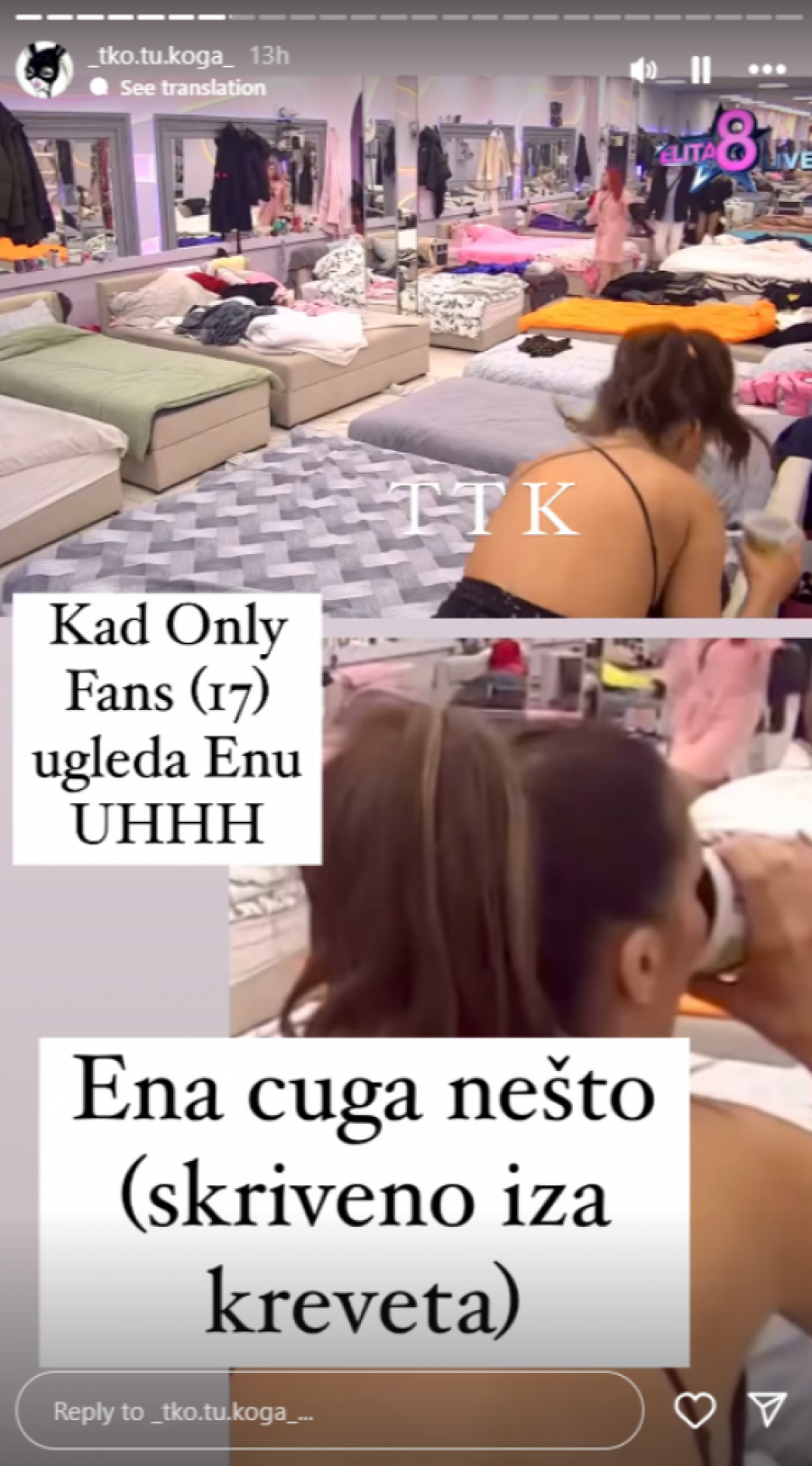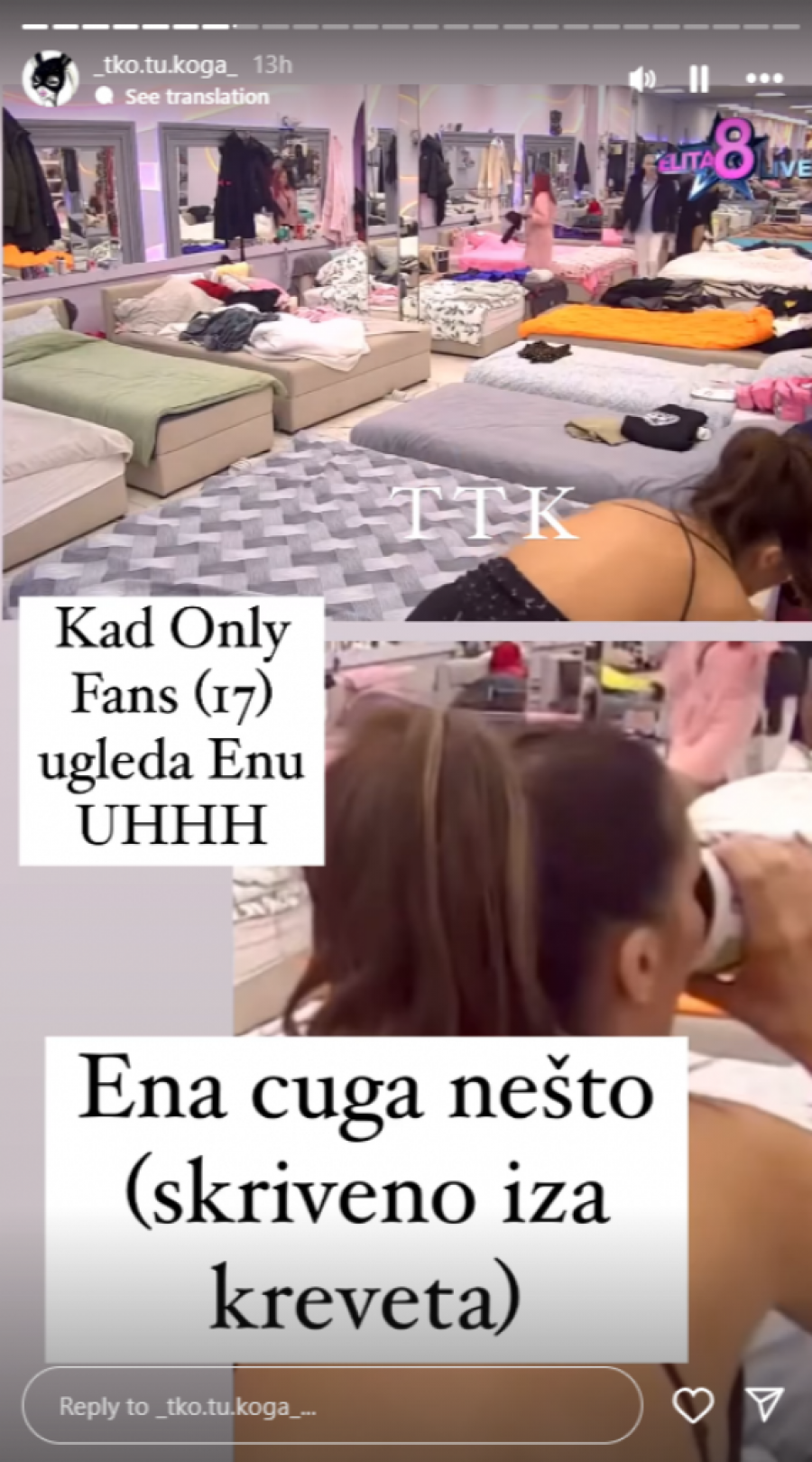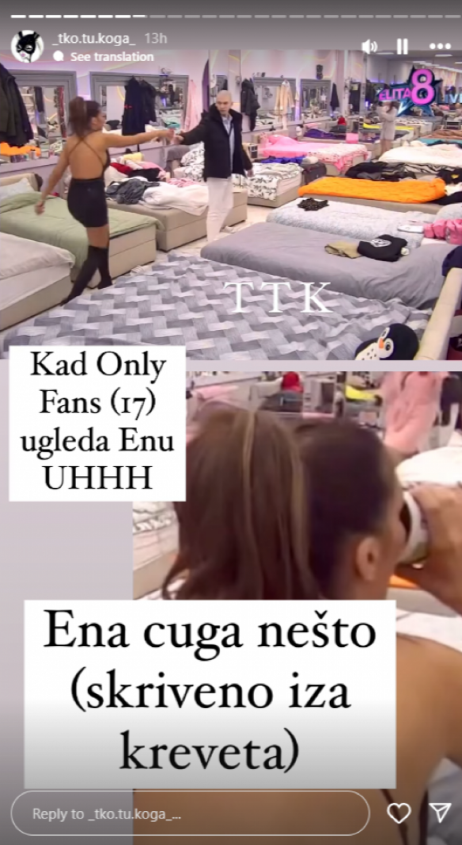 Na snimcima koji su se brzo proširili po društvenim mrežama, Ena je uhvaćena kako se krišom napija i to usred žurke. Iako je javnosti poznato da je rijaliti program podložan strogom nadzoru, čini se da Ena nije obazrivo pratila ta pravila. Na snimcima se jasno vidi kako se izdvaja od drugih učesnika i vidno pripita skriva flašu alkohola, a u nekoliko navrata pije u tišini, očigledno nesvesna da je snima budna kamera rijalitija.