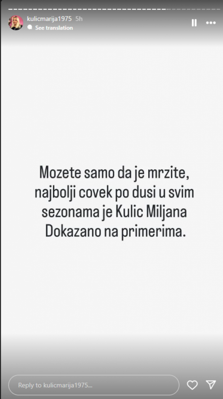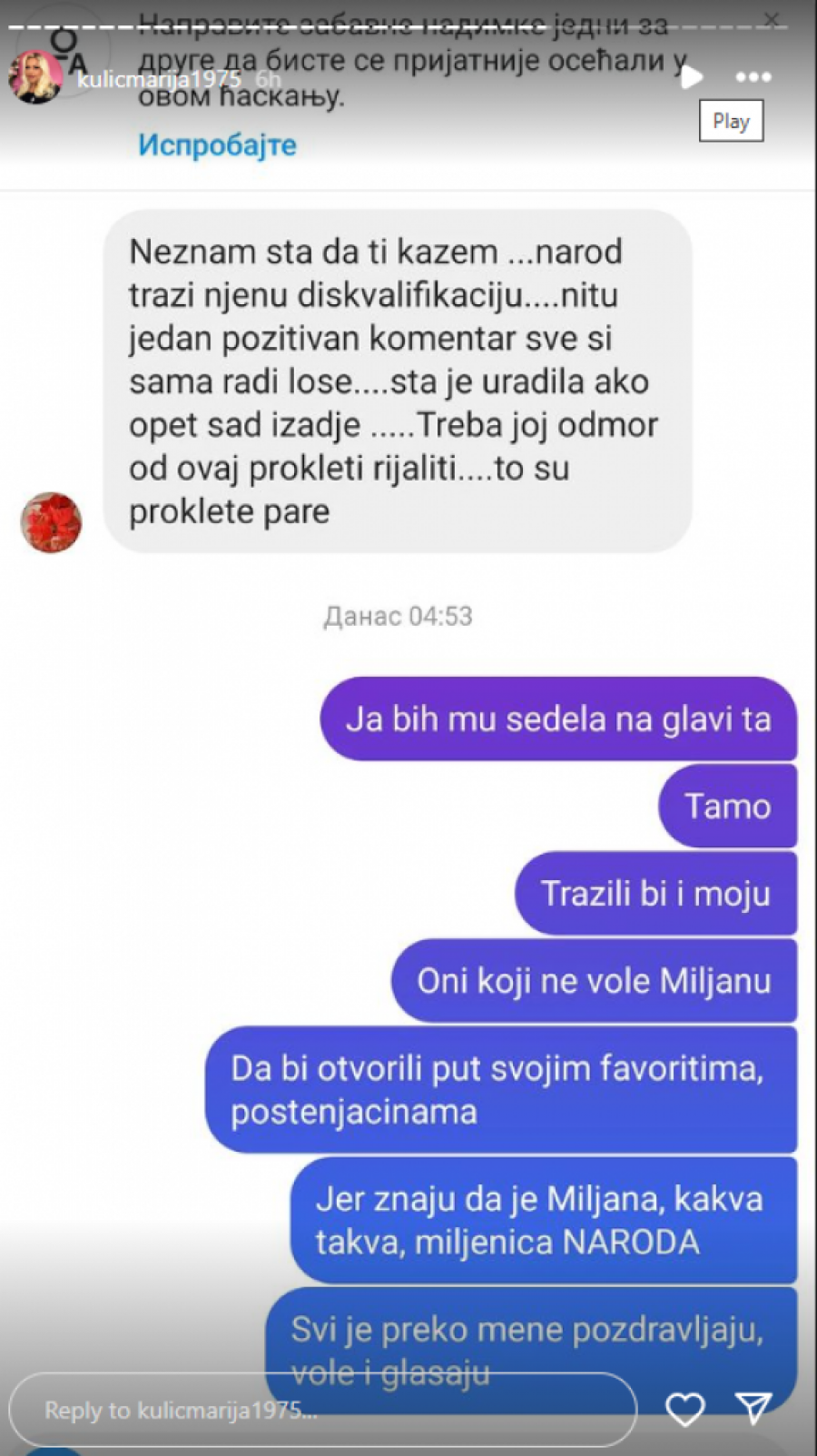 - Ja bih mu sedela na glavi tamo. Tražili bi i moju oni koji ne vole Miljanu, da bi otvorili put svojim favoritima, poštenjacima, jer znaju da je Miljana, kakva takva, miljenica NARODA. Svi je preko mene pozdravljaju, vole i glasaju - istakla je Kulićeva, koja je otkrila da je kaznila Miljanu: