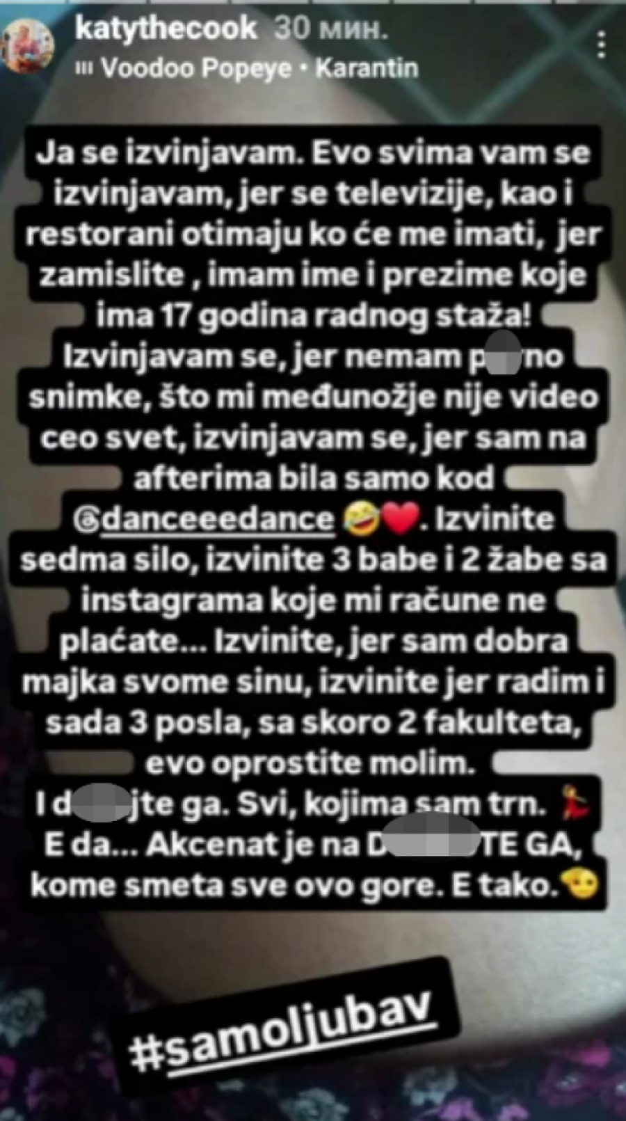 - Ja se izvinjavam. Eto svima vam se izvinjavam jer se televizije kao i restorani otimaju ko će me imati, jer zamislite, imam ime i prezime koje ima 17 godina radnog staža. Izvinjavam se jer nemam po*no snimke, što mi međunožje nije videlo ceo svet, izvinjavam se jer sam afterima bila samo kod jedne osobe. Izvinite sedma silo, izvinite tri babe i dve žabe sa Instagrama koje mi račune ne plaćate. Izvinite jer sam dobra majka svome sinu, izvinite jer radim i sada tri posla, sa skoro dva fakulteta, evo oprostite molim. I du*ajte ga svi kojima sam trn. E da, akcenat je na du*ajte ga komen smeta sve ovo gote. E, tako - napisala je Keti putem svg profila na društvenoj mreži Instagram.