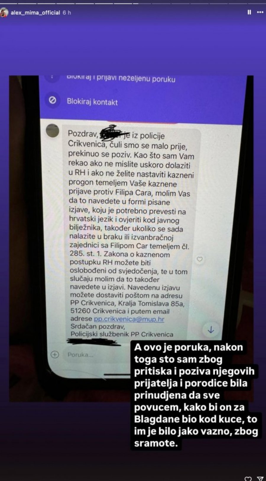 - Pustila sam ga dva dana, ali čovek očigledno ne želi da se zaustavi sa svojim lažima. Ta Jagodina koju spominje, bila sam na rođendanu kod drugarice, a u porukama možete videti kako me naziva i šta mi je sve pisao. U sledećih par storija se vidi kako me je ucenjivao i kako me je nazivao, a pošto laže i za policiju i za bolnicu, evo dokaza - napisala je prvo Aleks, nakon čega je sve poruke objavila.