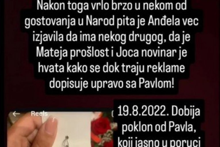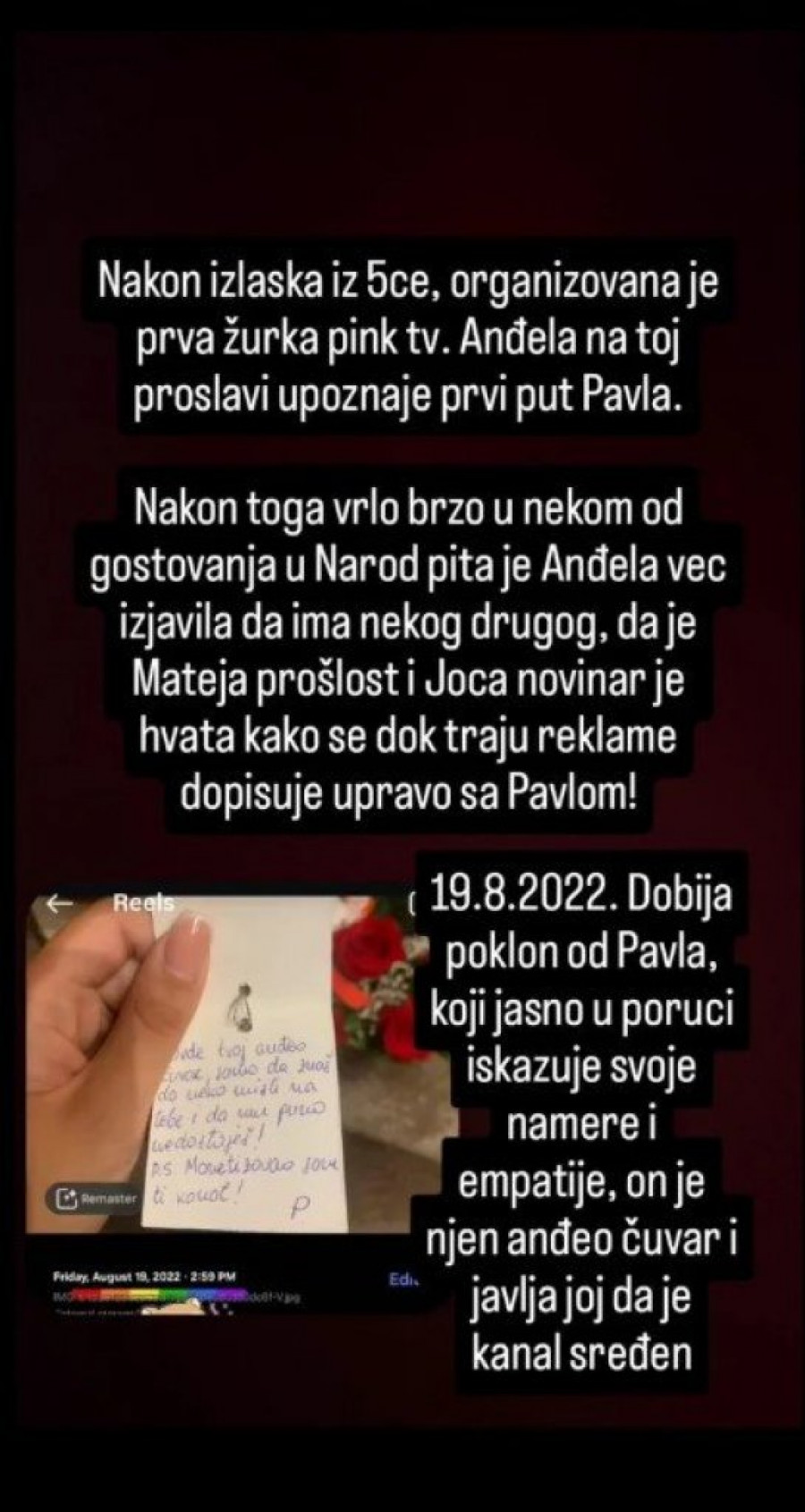 - Nakon izlaska iz petice organizovana je prva žurka Pink Tv. Anđela na toj proslavi prvi put upoznaje Pavla. Nakon toga, vrlo brzo u nekom od gostovanja u "Narod pita", Anđela je izjavila da ima nekog drugog, da je Mateja prošlost i novinar je hvata kako se, dok još traju reklame, dopisuje upravo sa Pavlom! 19.08.2022. dobija poklon od Pavla koji jasno u poruci iskazuje svoje namere i empatije. On je njen anđeo čuvar i javlja joj da je kanal sređen - pisalo je u prvom delu videa.