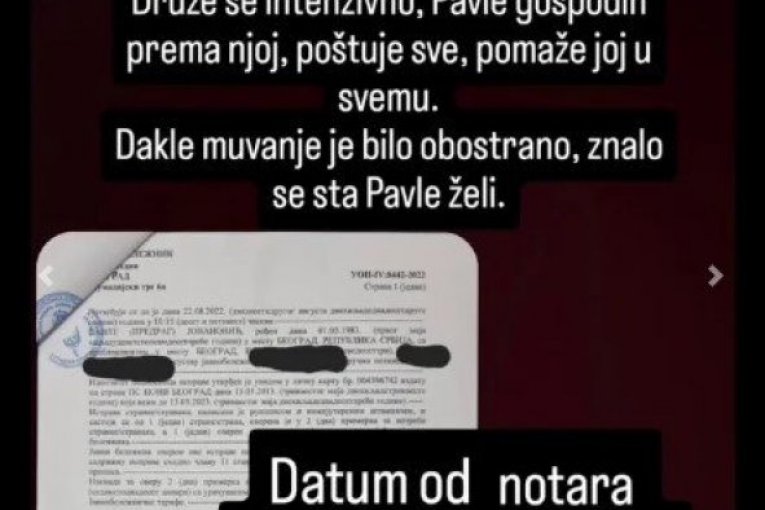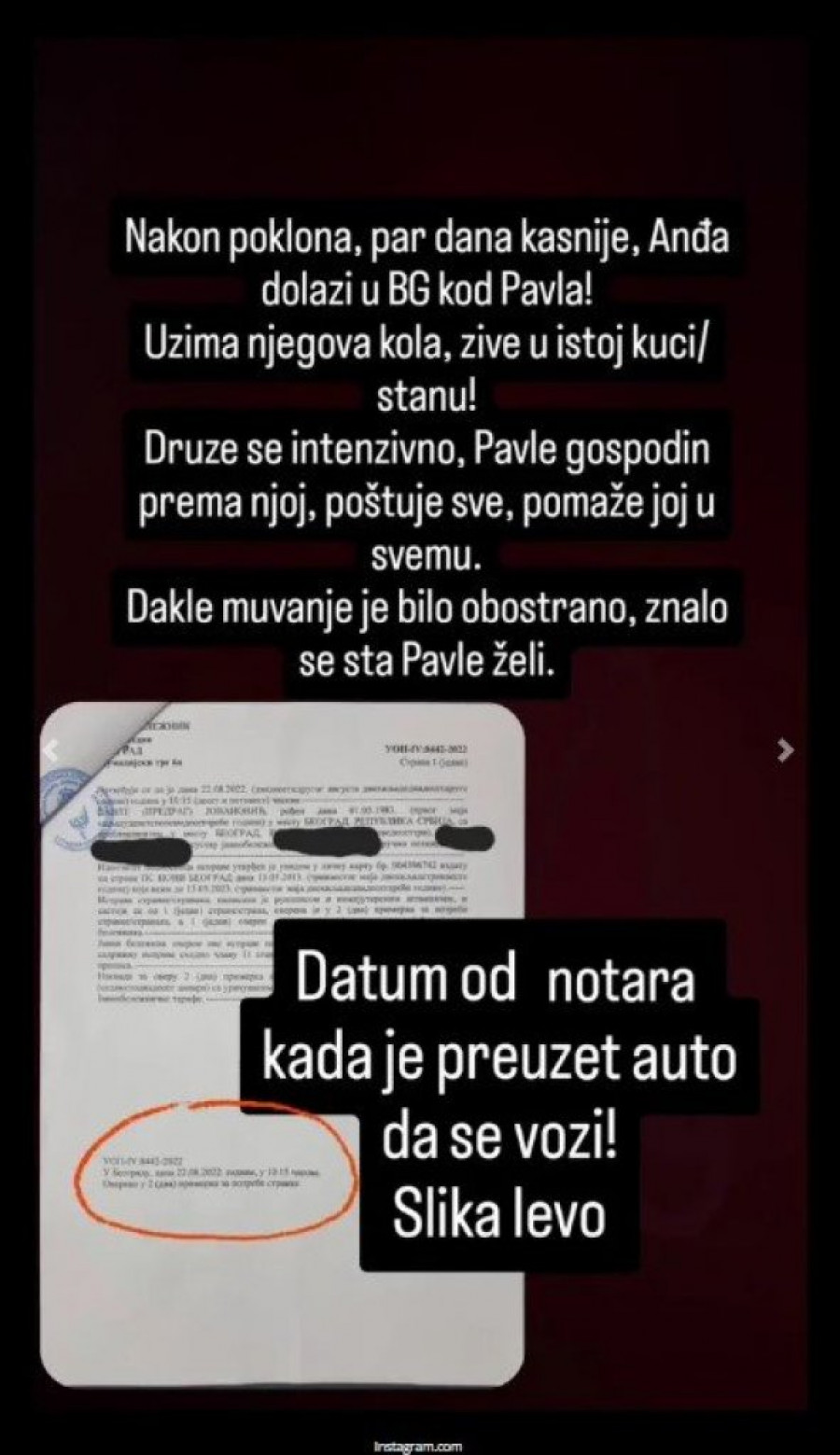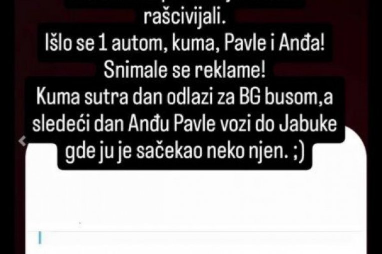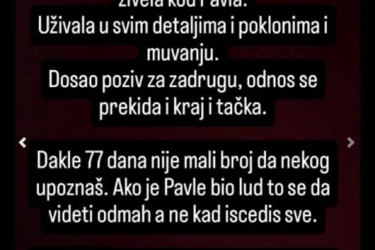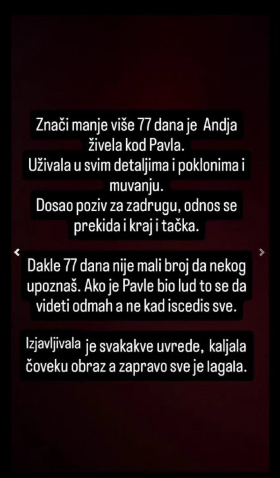 - Znači manje - više, 77 dana je Anđa živela kod Pavla. Uživala je u svim detaljima, poklonima i muvanju. Došao poziv za Zadrugu, odnos se prekrida i kraj i tačka. Dakle 77 dana nije mali broj da nekoga upoznaš. Ako je Pavle bio lud to se da videti odmah a ne kad iscediš sve. Izjavljivala je svakakve uvrede, kaljala čoveku obraz, a zapravo je sve slagala - pisalo je.