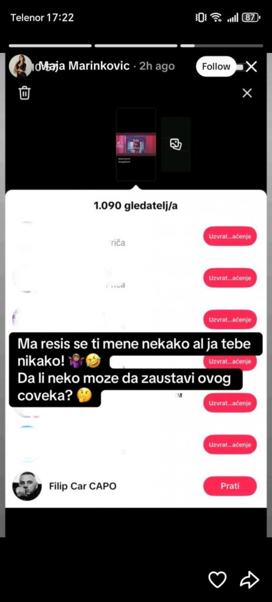 Maja je sada rešila da ode korak dalje i – raskrinka Filipa Cara! Na svom TikTok nalogu, Marinkovićeva je objavila skrinšot koji jasno pokazuje da joj Car i dalje prati objave, konkretno storije koje postavlja na toj mreži. Mnogi bi rekli – "uhodi je"! A ona mu nije ostala dužna.