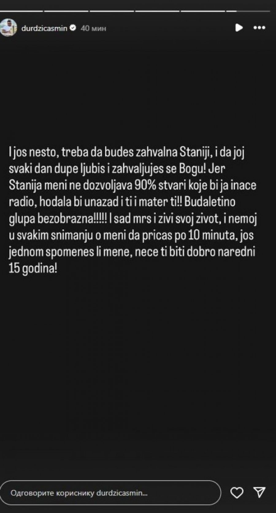 - I još nešto, trebaš da budeš zahvalna Staniji i da joj svakog dana du*e ljubiš i zahvaljuješ se Bogu. Jer Stanije ne dozvoljava 90% stvari koje bih inače radio, hodala bi unazad i ti i mater ti. Bu*aletino, glupa bezobrazna! I sada mrš i živi svoj život i nemoj u svakom snimanju o meni da pričaš po 10 minuta, još jednom spomeneš mene, neće ti biti dobro narednih 15 godina - istakao je Asmin Durdžić.