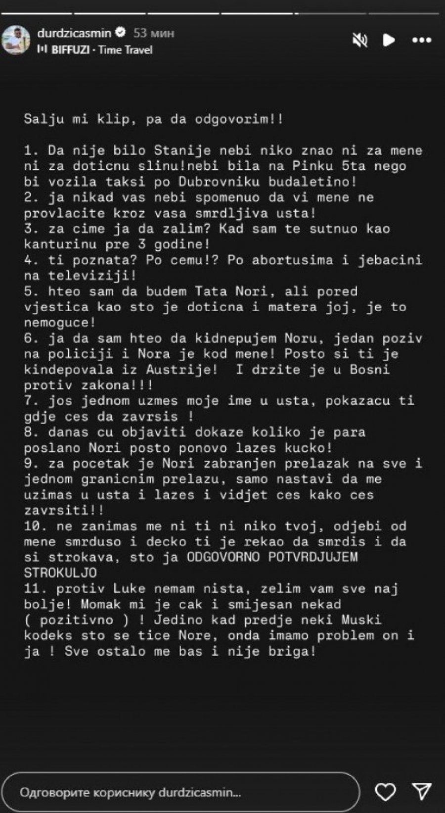 - Šalju mi klip, pa da odgovorim. Da nije bilo Stanije ne bi niko znao ni za mene, ni za dotičnu slinu! Ne bi bila na Pinku peta, nego bi vozila taksi po Dubrovniku, budaletino! Nikad vas ne bih spomenuo da vi mene ne provlačite kroz vaša smr*ljiva usta! Za čime ja da žalim? Kad sam te šutnio kao kanturinu pre tri godine! Ti poznata? Po čemu? Po abortusima i je***ini na televiziji! Hteo sam da budem tata Nori, ali pored veštica kao što je dotična i matere joj, je to nemoguće. Ja da sam hteo da kidnapujem Noru, jedan poziv policiji i Nora je kod mene! Pošto si je ti kidnapovala iz Austraije! I drižite je u Bosni protiv zakona! Još jednom da uzmeš moje ime u usta, pokaćau ti gde ćeš da završiš. Danas ću objaviti dokaze koliko je para poslato Nori, pošto ponovo lažeš ku**o. Za početak je Nori zabranjen zabranjen prelazak na svim graničnim prelazima, samo nastavi da me uzimaš u usta i lažeš i videćeš kako ćeš završiti. Ne zanimaš me ni ti, ni niko tvoj. Od**ebi od mene smr**šo i dečko ti je rekao da smrdiš i da si štrokava, što ja ODOGVORNO POVRĐUJEM ŠTROKULJO - napisao je Asmin, pa se dotakao i Luke: