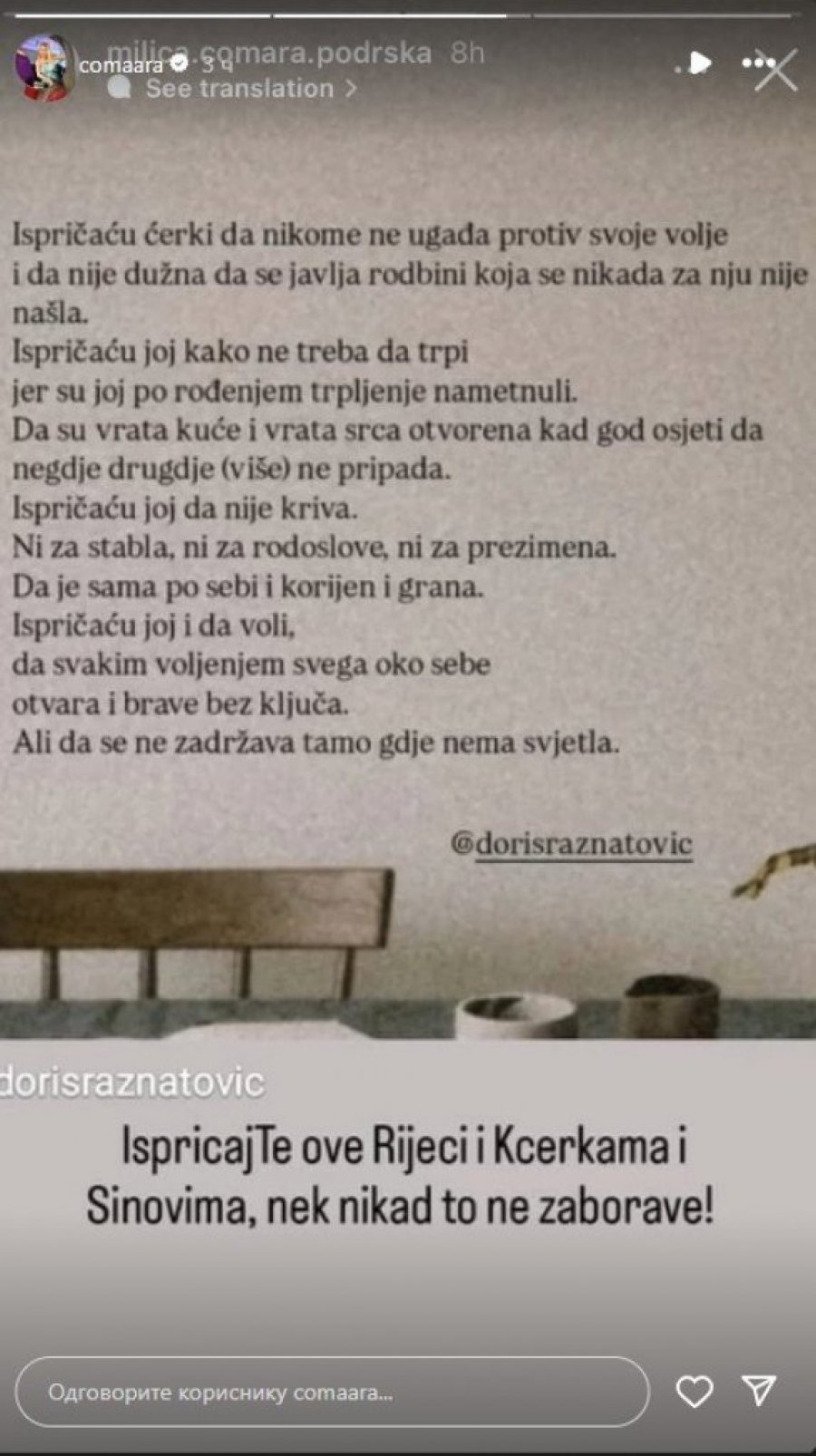 - Ispričaću ćerki da nikome ne ugađa protiv svoje volje i da nije dužna da se javlja rodbini koja se nikada nju nije našla. Ispričaću joj kako ne treba da trpi, jer su joj po rođenjem trpljenje nametnuli. Da su vrata kuće i vrata srca otvorena kad god oseti da negde drugde (više) ne pripada. Ispričaću joj da nije kriva, ni za stabla, ni za rodoslovem, ni za prezimena. Da je sama po sebi i koren i grana. Ispričaću joj i da voli, da svakim voljenjem svega oko sebe otvara i brave bez ključa. Ali, da se ne zadržava tamo gde nema svetla - poručila je Milica.