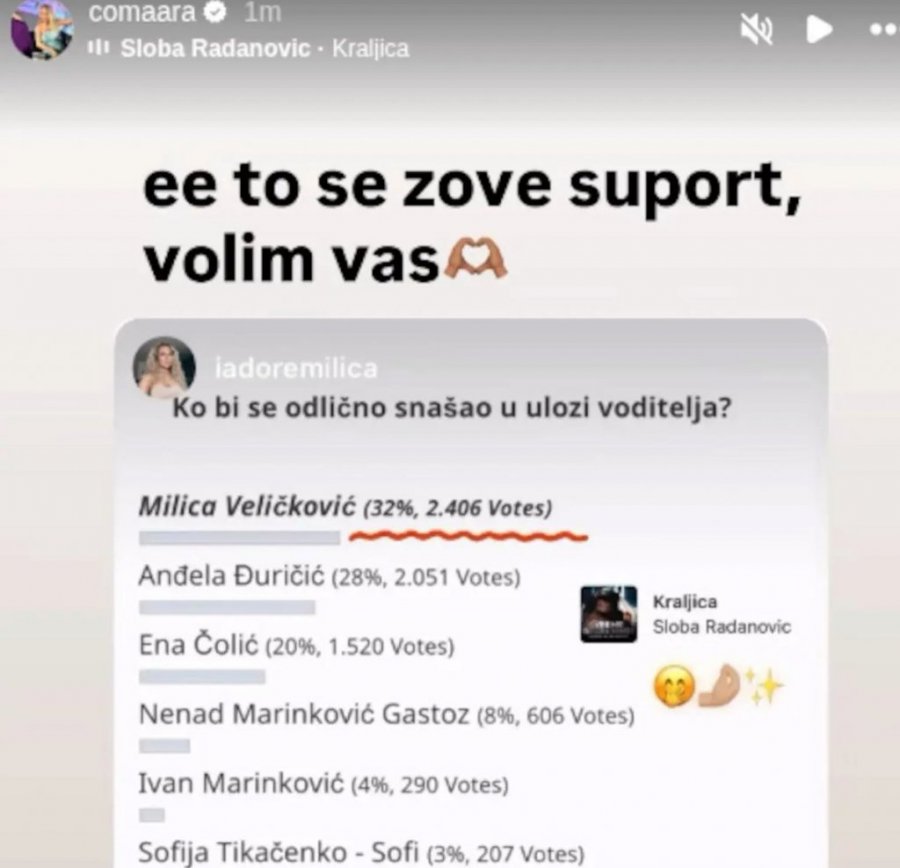 "E to se zove suport, volim vas", pokazujući zahvalnost prema svojim fanovima. U pozadini storija čula se pesma "Kraljica“ Slobe Radanovića, što dodatno pojačava emotivni ton objave. Ovaj uspeh može otvoriti vrata za Milicu u medijima, a njen status u očima publike možda će joj omogućiti da se pridruži redovima nekih od bivših rijaliti učesnika koji su postali voditelji.