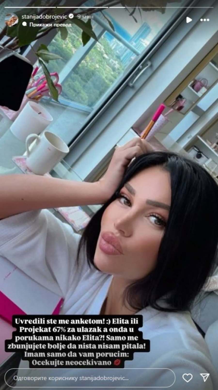 - Uvredili ste me anketom. Elita ili Projekat, 67% za ulazak, a onda u porukama nikako Elita?! Samo me zbunjujete bolje da ništa nisam pitala. Imamo samo da vam poručim: Očekujte neočekivano - poručila je Stanija.