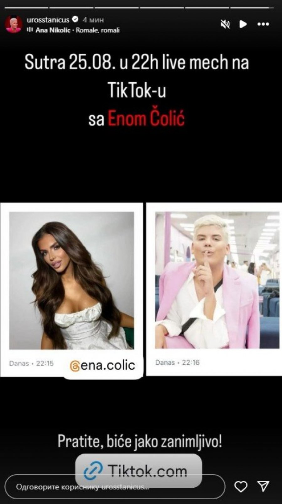 Naime, bivši učesnik Uroš Stanić najavio je uživo uključenje na Tik-toku, gde će gost biti Ena Čolić, a očekuje se da će diskusija biti sve samo ne mirna. Njihova povezanost i odnosi unutar rijalitija često su izazivali burne reakcije gledalaca, a mnogi veruju da će i ovaj put lajv biti pun prozivki, iznošenja šokantnih detalja i "pranja veša pred hiljadama fanova.