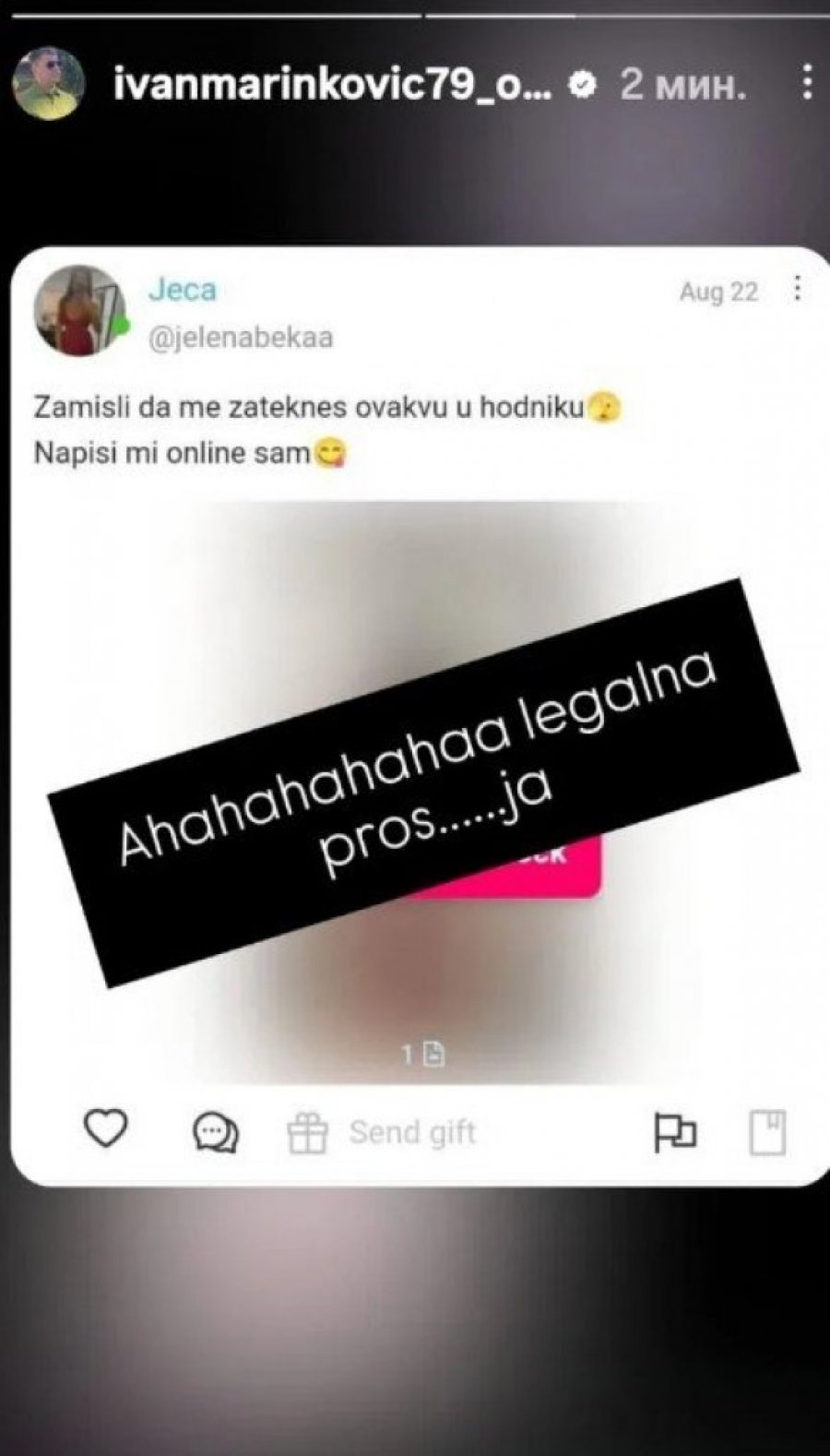Marinković nije mogao da odoli i odmah je reagovao na društvenim mrežama. Na svom Instagram storiju, podelio je objavu sa Jeleninog profila uz sarkastičan komentar: