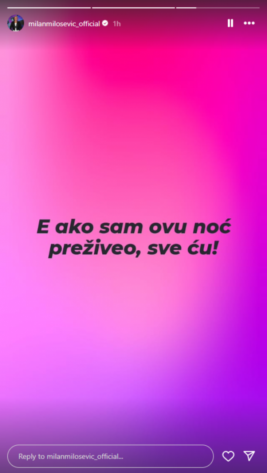 Ova scena pogodila je mnoge fanove, koji su zatrpali komentare podrške i zabrinutih poruka, nadajući se da će se njihov miljenik što pre oporaviti. Tako je i bilo - nakon paklene noći, Milošević je jutros ponovo poslao poruku svojim pratiocima, priznajući da mu je bilo toliko loše da je u jednom trenutku pomislio da neće izdržati.