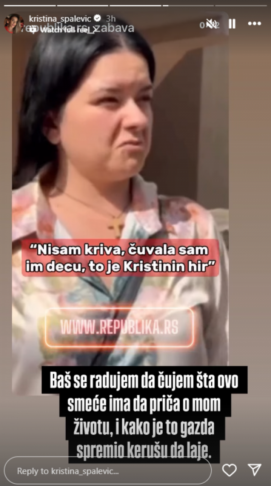 Kristina Spalević nije dugo čekala na odgovor i odmah je izrazila svoje nezadovoljstvo putem društvenih mreža, gde je ostavila jasnu poruku Aleksandri, koja se takođe odnosila na njenog bivšeg parnera, Kristijana Golubovića: