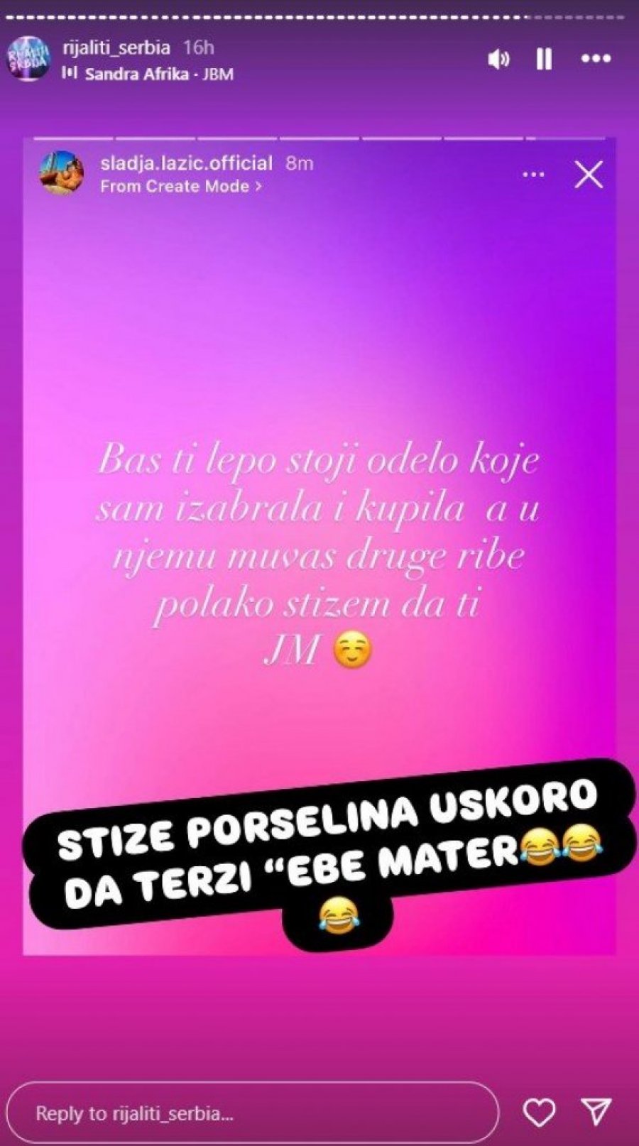 - Baš ti lepo stoji odelo koje sam ti izabrala i kupila, a u njemu muvaš druge ribe. Polako, stižemi ja da ti *M - napisala je Slađa na storiju.