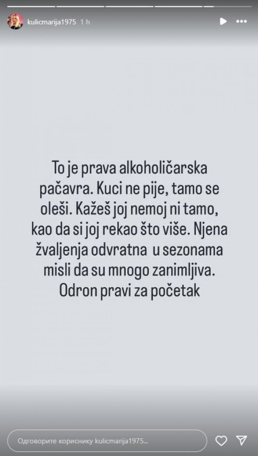 - To je prava alkoholičarska pačavra. Kući ne pije, tamo se oleši. Kažeš joj nemo ni tamo, kao da si joj rekao što više. Njena zvaljenja odvratna u sezonama misli da su mnogo zanimljiva. Odron prvi za početak - napisala je Marija na svom instagramu.