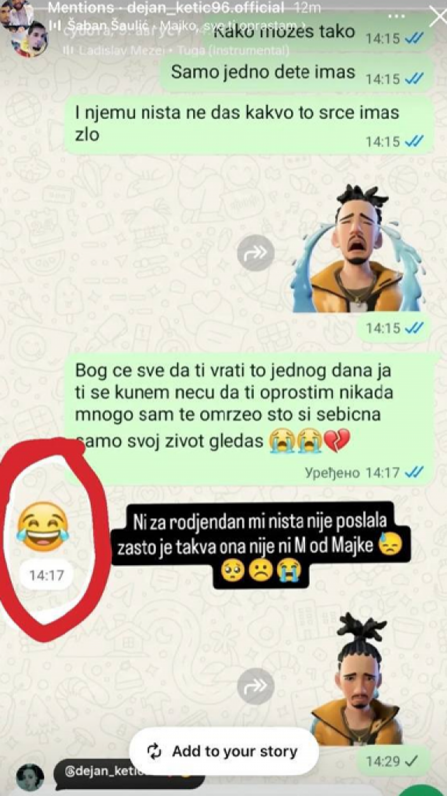 - Bog će da ti vrati jednog dana, ja ti se kunem, neću da ti oprostim nikada. Mnogo sam te omrzeo što si sebična, samo svoj život gledaš - pisao je Dejan svojoj majci na dan svog rođendana, nakon čega je ona odgovorila samo smajlijem koji se cinično smeje.