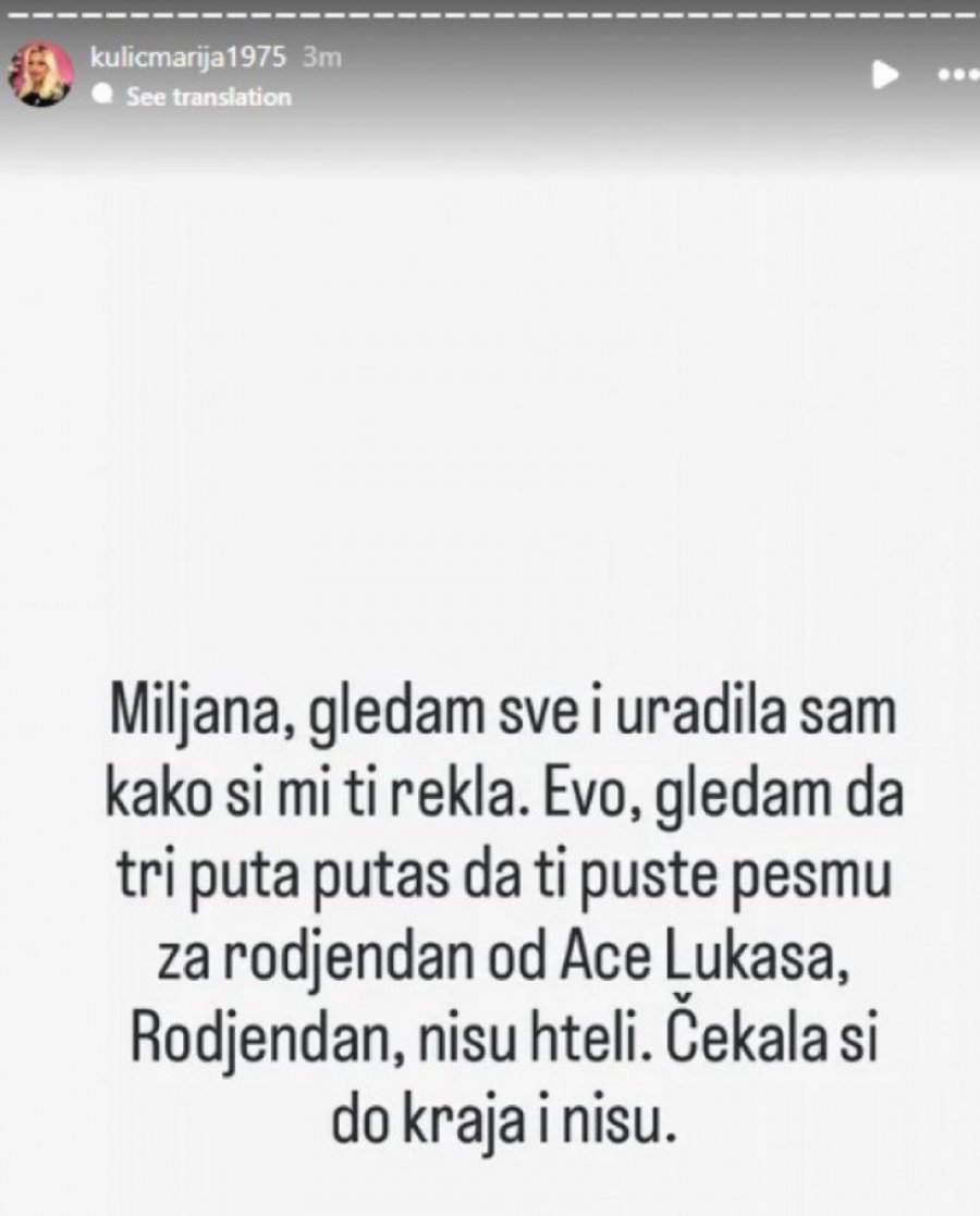 - Miljana, sve sam gledala i uradila kako si mi rekla. Tri puta sam pokušala da ti puste pesmu 'Rođendan' od Ace Lukasa – nisu hteli. Čekala si do kraja, ali nisu je pustili. Znam koliko ti je to značilo... - napisala je Marija na Instagramu.