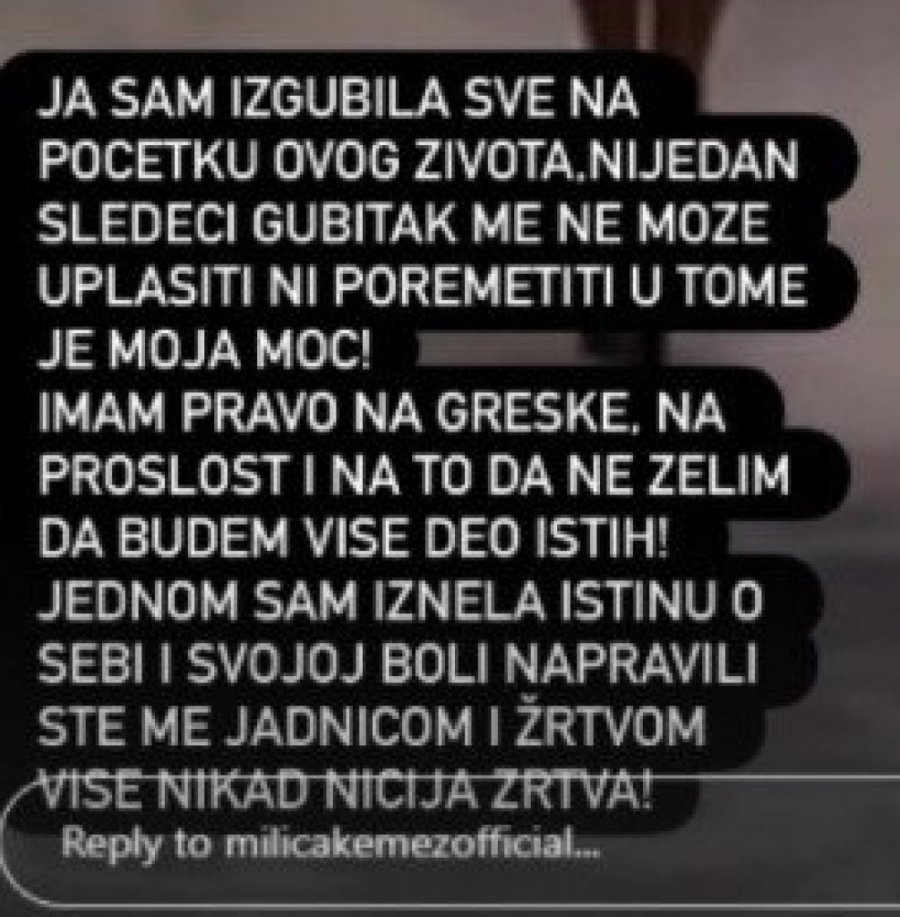 - Izgubila sam sve na početku ovog života i nijedan sledeći gubitak me ne može uplašiti ni poremetiti u tome i to je moja moć! Imam pravo na greške, na prošlost i na to da ne želim da budem više deo istih! Jednom sam iznela istinu o svojoj boli i napravili ste me jadnicom i žrtvom, više nikada ničija žrtva - poručila je Milica.