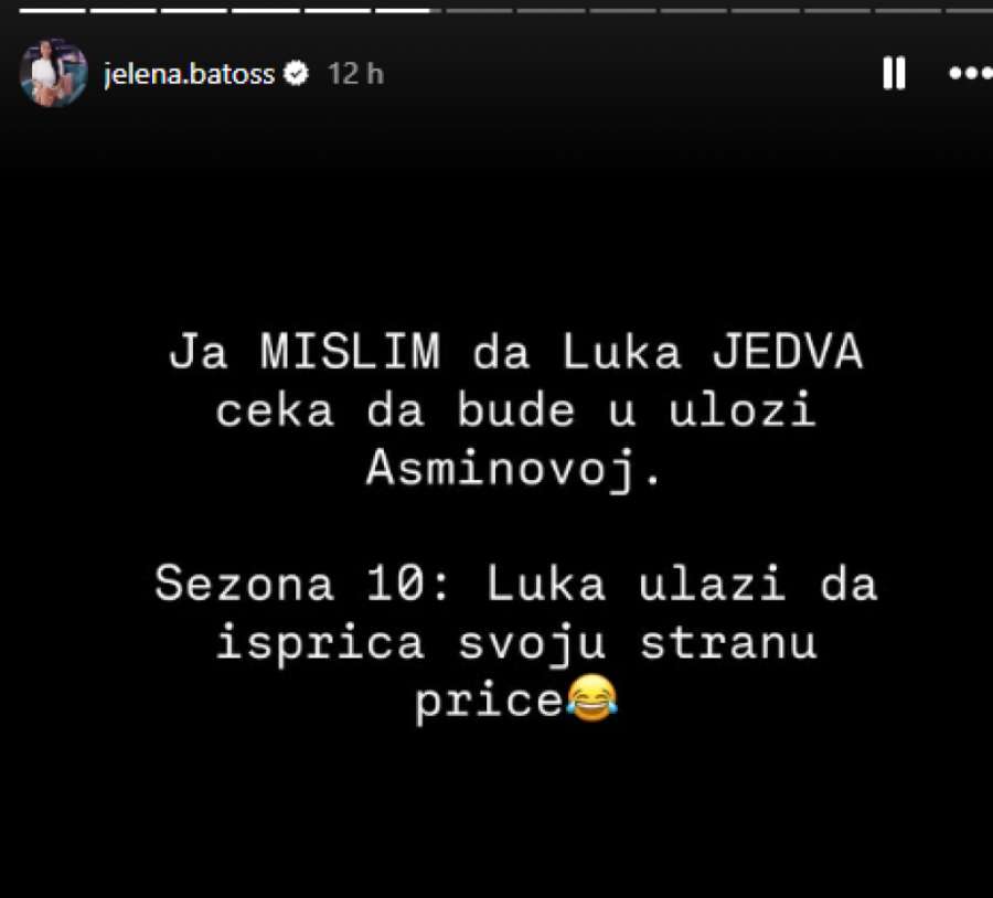Bivša zadrugarka Jelena Batos redovno komentariše dešavanja u rijalitiju "Elita", pa je tako ovog puta na meti bio Luka Vujović. Iako se, pre svega, složila s Asminom Durdžićem, Jelena je iznela mišljenja da Vujović želi da bude u njegovoj koži.