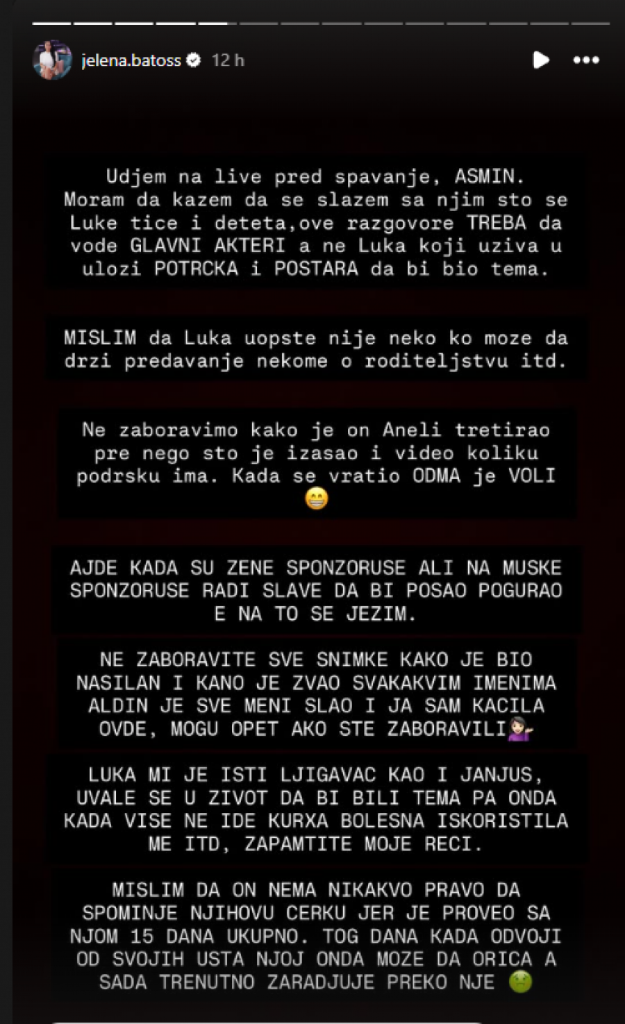 - Uđem na uživo prenos pred spavanje, Asmin. Moram da kažem da se slažem s njim što se Luke tiče i deteta, ove razgovore treba da vode glavni akteri, a ne Luka, koji uživa u ulozi potrčka i poštara da bi bio tema. Mislim da Luka uopšte nije neko ko može da drži predavanje nekome o roditeljstvu. Ne zaboravimo kako je on Aneli tretirao pre nego što je izašao i video koliku podršku ima. Kada se vratio, odmah je voli. Ajde kada su žene sponzoruše, ali na muške sponzoruše radi slave da bi posao pogurao, e na to se ježim - započela je Jelena, pa nastavila: