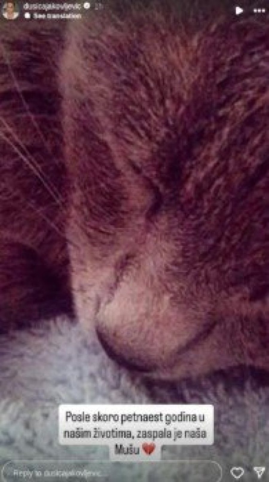 Dušica Jakovljević, poznata i draga voditeljka najpopularnijeg rijalitija, podelila je emotivnu objavu na društvenim mrežama u kojoj je obavestila javnost o smrti svoje omiljene mace po imenu Muša.