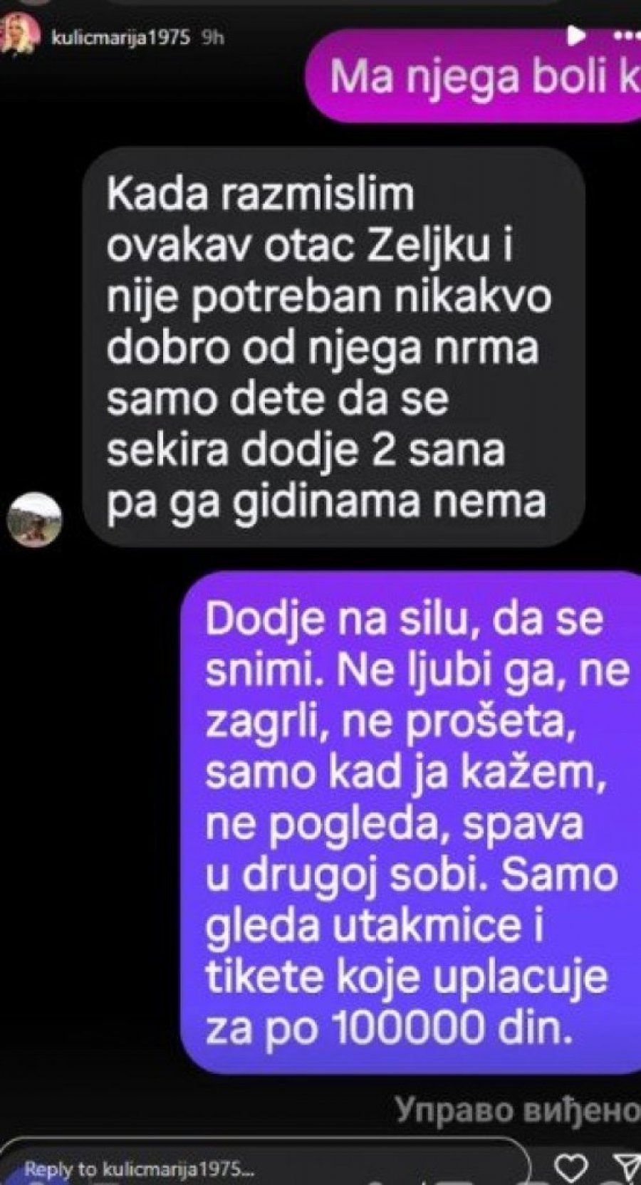 - Dođe na silu da se snimi, ne ljubi ga, ne zagrli ga, ne prošeta ga, samo kad ja kažem. Ne pogleda ga, spava u drugoj sobi. Samo gleda utakmice i tikete koje uplaćuje za po 100.000 dinara - napisala je Marija ukazujući na očigledan nedostatak emocija i bliskosti između oca i sina.