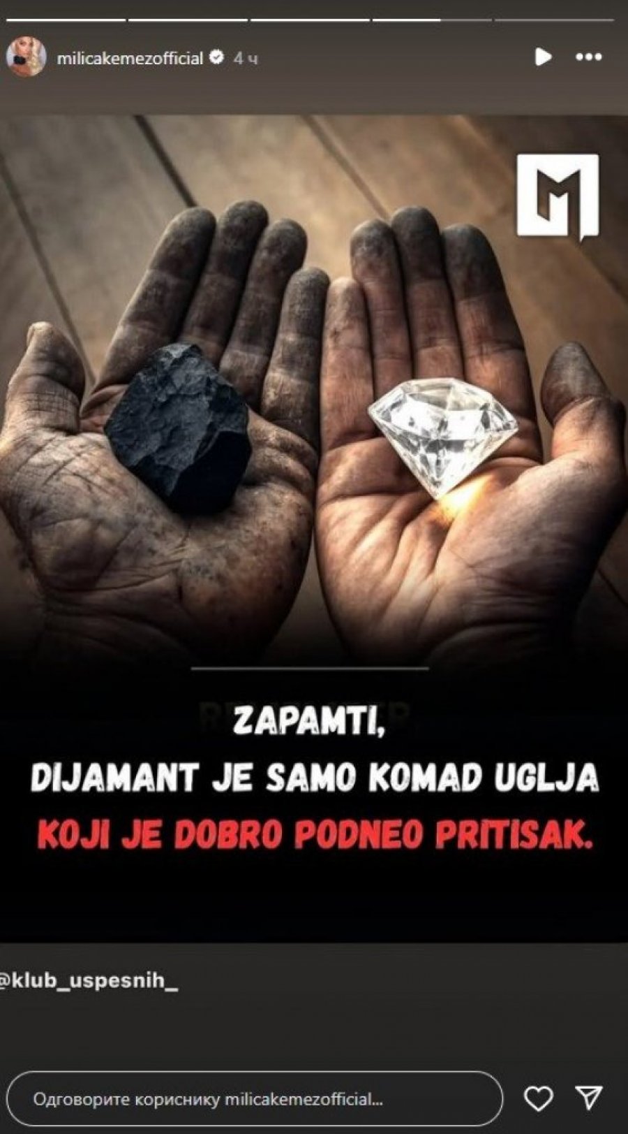 - Zapamti, dijamant je samo komad uglja koji je dobro podneo pritisak - objavila je ona na privatnom profilu.