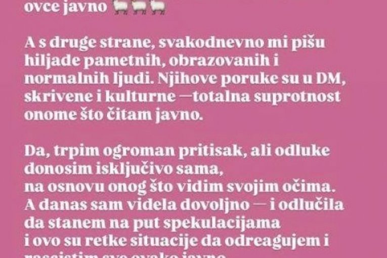 - Primorana sam da se oglasim jer je očigledno da se neko previše zaigrao rijalitija. Ne znam da li je dobio neke "instrukcije" ili mu je neko napunio glavu u vezi mene, ali za ovakvo ponašanje jednostavno nema opravdanja - zapičela je u svojoj objavi Stanija pa nastavila: