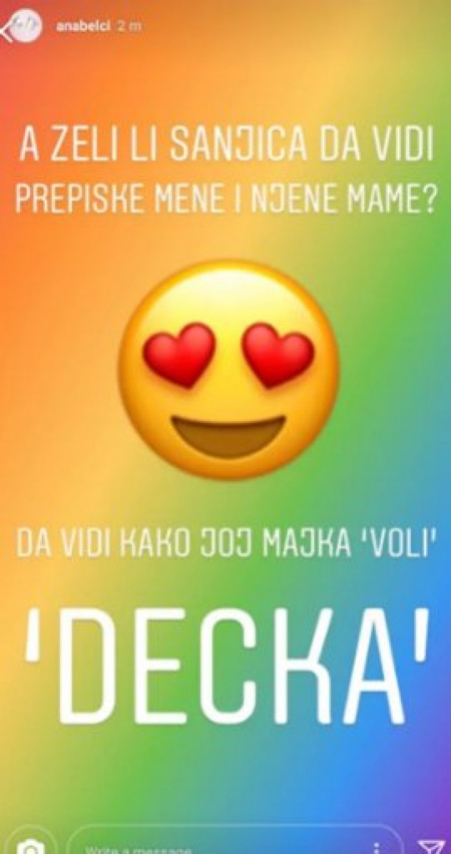 Foto: printscreen/instagram- A želi li Sanjica da vidi prepiske mene i njene mame, da vidi kako joj majka "voli dečka" - upitala je Anabela koja je Sanju želela da isprovicira na račun njene emotivne veze koju je u rijalitiju otpočela sa Matorom.
