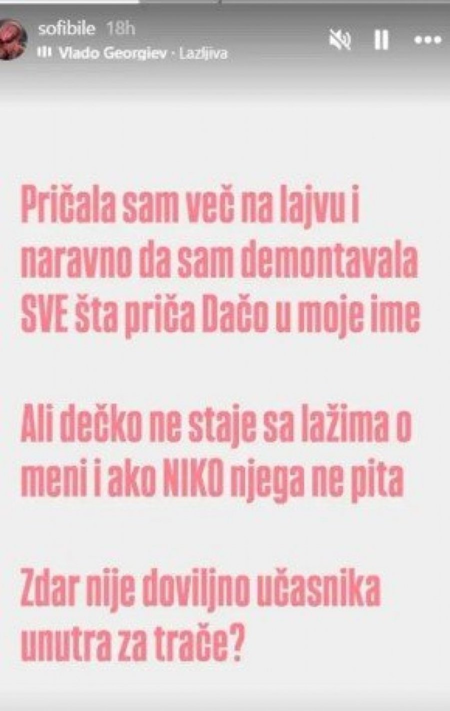 - Pričala sam sve na lajvu i naravno da sam demantovala sve šta Dačo priča u moje ime. Ali dečko ne staje sa lažima iako ga niko ništa nije pitao. Zar nije već dovoljno učesnika unutra za tračeve? - pitala je Sofija.