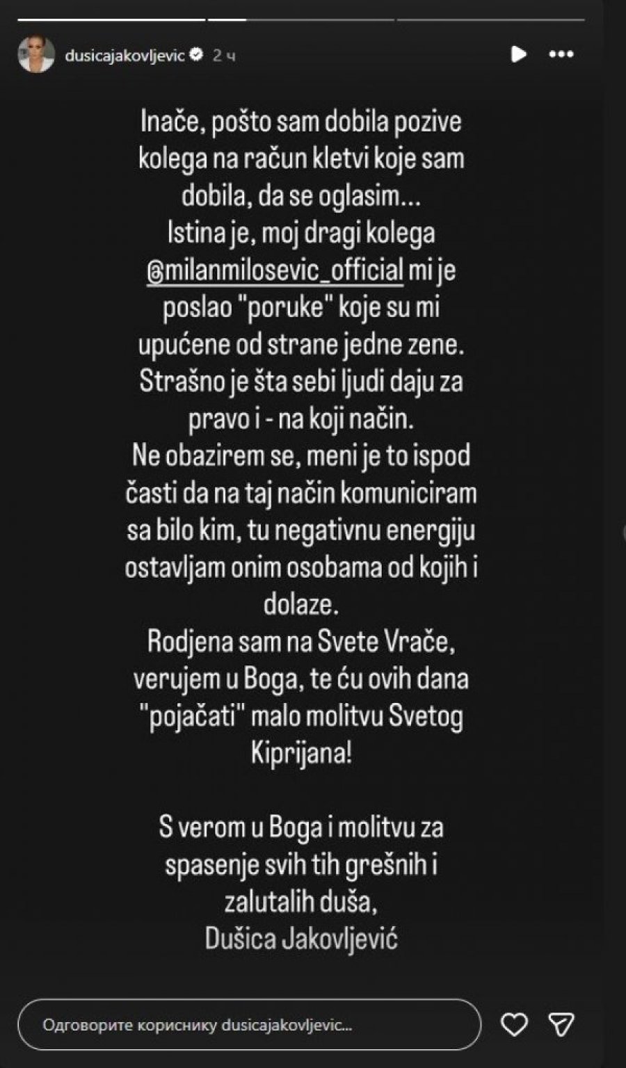 – Inače, pošto sam dobila pozive kolega na račun kletvi koje sam dobila, da se oglasim... Istina je, moj dragi kolega Milan Milošević mi je poslao „poruke“ koje su mi upućene od strane jedne žene – započela je Dušica svoje obraćanje.