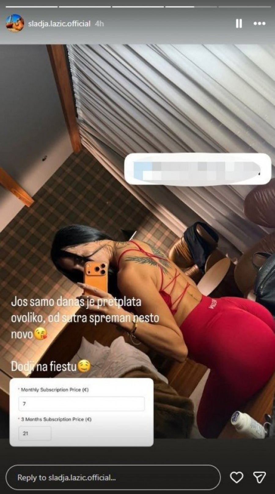 Bivša zadrugarka i starleta Slađana Lazić, poznatija kao Slađa Poršelina, nedavno je privukla pažnju javnosti svojim novim korakom - pridružila se sajtu za odrasle. Ovaj potez je očigledno doneo finansijsku dobit, jer se čini da "mlati ozbiljne pare". Slađa se aktivno promoviše na društvenim mrežama, a njeni "storiji" otkrivaju kako nudi atraktivne ponude za svoje obožavaoce. Tako, za svega sedam evra mesečno, ili 21 evro za tri meseca, svi zainteresovani mogu da uživaju u njenom sadržaju. Na društvenim mrežama, ističe da je to "samo danas" posebna ponuda, naglašavajući promene koje planira za sutra.