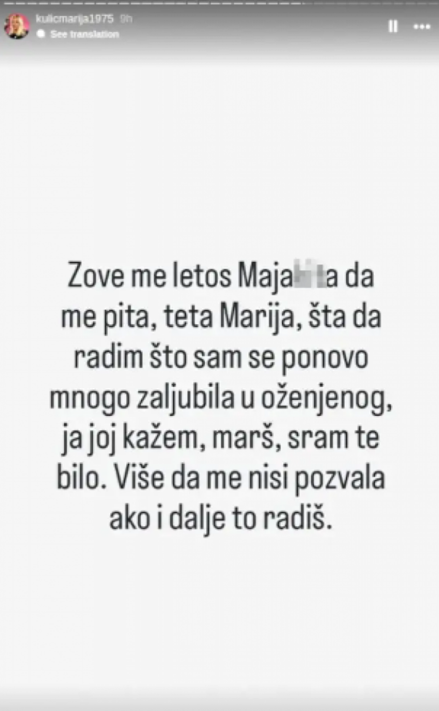 - Zove me letos Maja da me pita, teta Marija, šta da radim što sam se ponovo zaljubila u oženjenog. Ja joj kažem, marš, sram da te bude. više da me nisi pozvala ako i dalje to radiš - napisal je Marija.