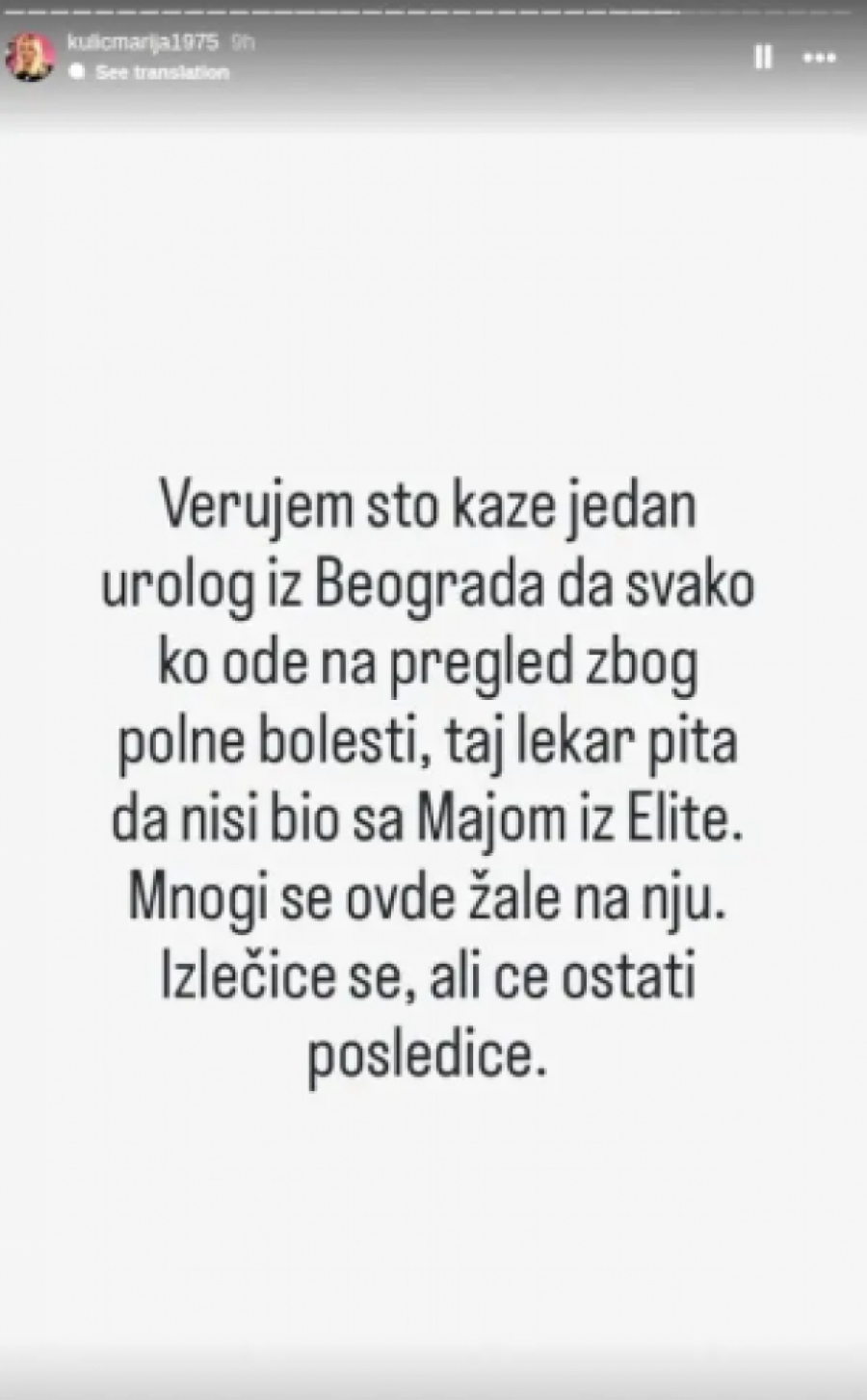 - Verujem što kaže jedan urolog iz Beograda da svako ko ode na pregled zbog polne bolesti, taj lekar pita da nije bio sa Majom iz Elite. Mnogi se ovde žale na nju. izlečiće se, ali će ostati posledice - stoji u objavi.