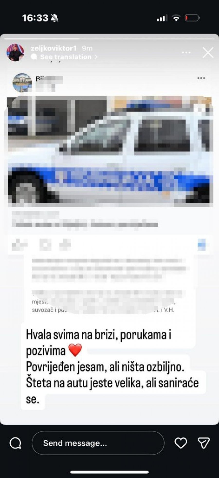 – Hvala svima na brizi, porukama i pozivima. Povređen sam, ali na sreću nije ništa ozbiljno. Automobil je pretrpeo veliku štetu, ali to će se vremenom sanirati – poručio je Viktor, naglasivši da je zahvalan što je sve moglo da prođe i mnogo gore.