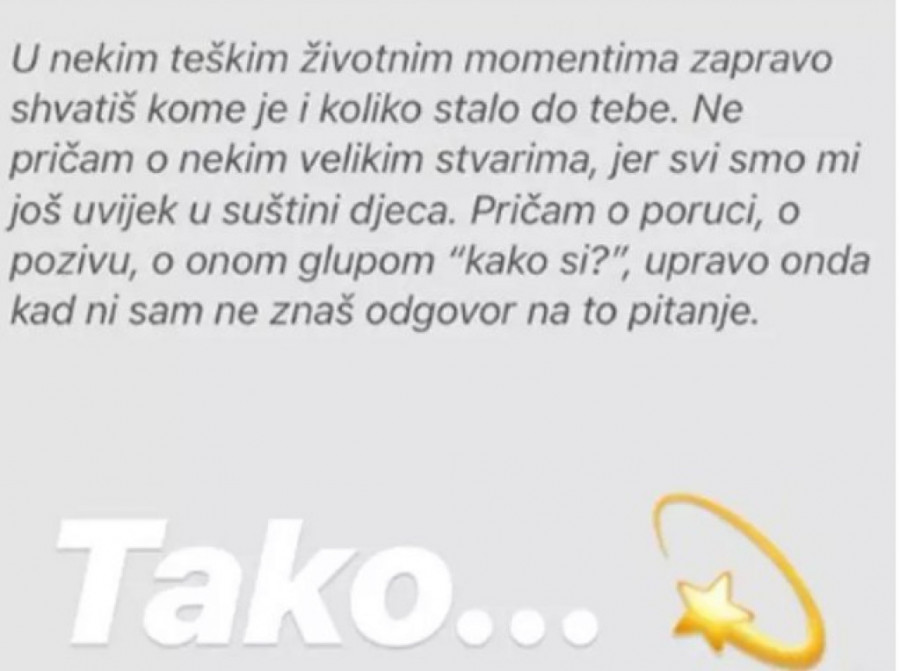 - U nekim teškim životnim momentima zapravo shvatiš kome je i koliko stalo do tebe. Ne pričam o nekim velikim stvarima, jer svi smo mi još uvek u suštini deca. Pričam o poruci, o pozivu, o onom glupom ''kako si?'', upravo onda kad ni sam ne znaš odgovor na to pitanje - glasi citat koji je Luna podelila sa svojim pratiocima na Instagramu i svojim komentarom ''Tako'' jasno stavila do znanja da se u njemu pronalazi, a da li je ova poruka upućena upravo Slobi, ostaje da saznamo.